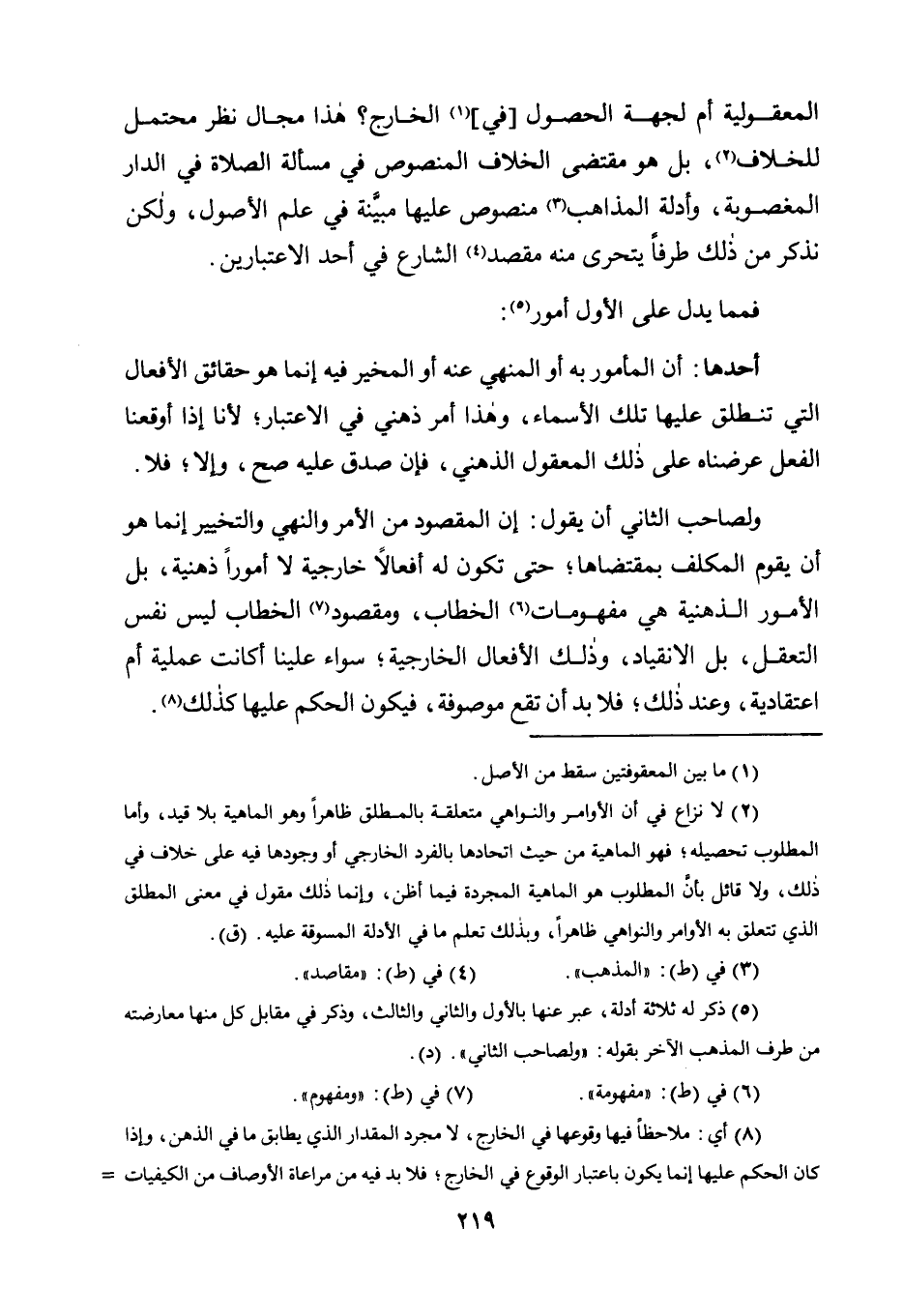 2 لا نزاع في أن الأوامر والنواهي متعلقة بالمطلق ظاهرا وهو الماهية بلا قيد، وأما المطلوب تحصيله؛ فهو الماهية من حيث اتحادها بالفرد الخارجي أو وجودها فيه على خلاف في ذلك، ولا قائل بأن المطلوب هو الماهية المجردة فيما أظن، وإنما ذلك مقول في معنى المطلق الذي تتعلق به الأوامر والنواهي ظاهرا، وبذلك تعلم ما في الأدلة المسوقة عليه. "ق".