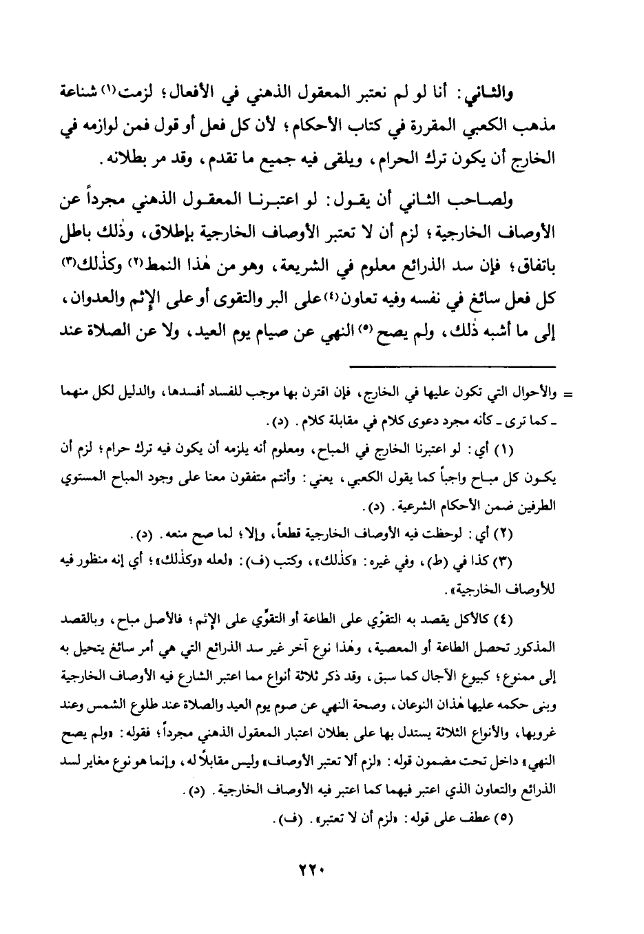 أَنَّا لَوْ لَمْ نَعْتَبِرِ الْمَعْقُولَ الذِّهْنِيَّ فِي الْأَفْعَالِ؛ لَزِمَتْ1 شَنَاعَةُ مَذْهَبِ الْكَعْبِيِّ الْمُقَرَّرَةُ فِي كِتَابِ الْأَحْكَامِ؛ لِأَنَّ كُلَّ فِعْلٍ أَوْ قَوْلٍ فَمِنْ لَوَازِمِهِ فِي الْخَارِجِ أَنْ يَكُونَ تَرَكَ الْحَرَامَ، وَيَلْقَى فِيهِ جَمِيعَ مَا تَقَدَّمَ، وَقَدْ مَرَّ بُطْلَانُهُ.