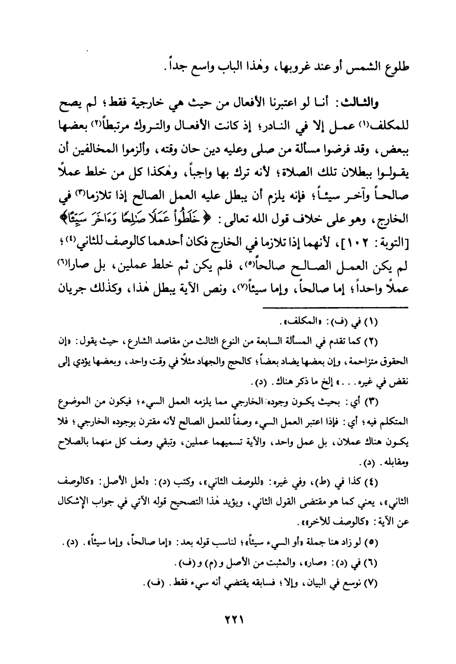 أَنَّا لَوِ اعْتَبَرْنَا الْأَفْعَالَ مِنْ حَيْثُ هِيَ خَارِجِيَّةٌ فَقَطْ؛ لَمْ يَصِحَّ لِلْمُكَلَّفِ1 عَمَلٌ إِلَّا فِي النَّادِرِ؛ إِذْ كَانَتِ الْأَفْعَالُ وَالتُّرُوكُ مُرْتَبِطًا2 بَعْضُهَا بِبَعْضٍ، وَقَدْ فَرَضُوا مَسْأَلَةَ مَنْ صَلَّى وَعَلَيْهِ دَيْنٌ حَانَ وَقْتُهُ، وَأَلْزَمُوا الْمُخَالِفِينَ أَنْ يَقُولُوا بِبُطْلَانِ تِلْكَ الصَّلَاةِ؛ لِأَنَّهُ تَرَكَ بِهَا وَاجِبًا، وَهَكَذَا كُلٌّ مَنْ خَلَطَ عَمَلًا صَالِحًا وَآخَرَ سَيِّئًا؛ فَإِنَّهُ يَلْزَمُ أَنْ يُبْطِلَ عَلَيْهِ الْعَمَلَ الصَّالِحَ إِذَا تَلَازَمَا3 فِي الْخَارِجِ، وَهُوَ عَلَى خِلَافِ قَوْلِ اللَّهِ تَعَالَى: {خَلَطُوا عَمَلًا صَالِحًا وَآخَرَ سَيِّئًا} [التَّوْبَةِ: 102] ، لِأَنَّهُمَا إِذَا تَلَازَمَا فِي الْخَارِجِ فَكَانَ أَحَدُهُمَا كالوصف للثاني4؛ لَمْ يَكُنِ الْعَمَلُ الصَّالِحُ صَالِحًا5، فَلَمْ يَكُنْ ثَمَّ خَلْطُ عَمَلَيْنِ، بَلْ صَارَا6 عَمَلًا وَاحِدًا؛ إِمَّا صَالِحًا، وَإِمَّا سَيِّئًا7، وَنَصُّ الْآيَةِ يُبْطِلُ هذا، وكذلك جريان