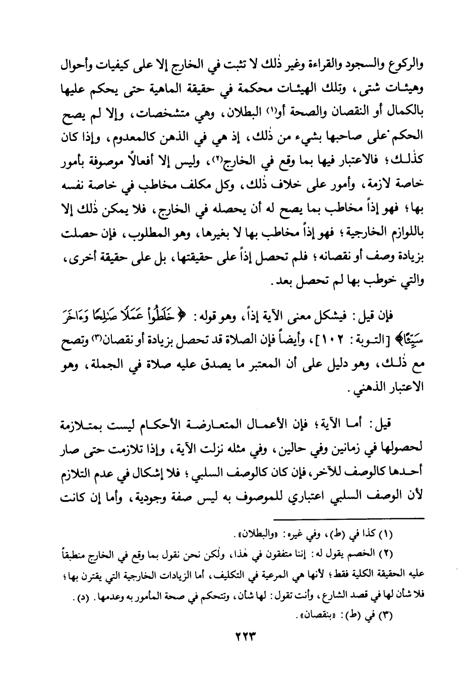 فَإِنْ قِيلَ: فَيُشْكِلُ مَعْنَى الْآيَةِ إِذًا، وَهُوَ قَوْلُهُ: {خَلَطُوا عَمَلًا صَالِحًا وَآخَرَ سَيِّئًا} [التَّوْبَةِ: 102] ، وَأَيْضًا فَإِنَّ الصَّلَاةَ قَدْ تَحْصُلُ بِزِيَادَةٍ أَوْ نُقْصَانٍ3 وَتَصِحُّ مَعَ ذَلِكَ، وَهُوَ دَلِيلٌ عَلَى أَنَّ الْمُعْتَبَرَ مَا يَصْدُقُ عَلَيْهِ صَلَاةٌ فِي الْجُمْلَةِ، وَهُوَ الِاعْتِبَارُ الذِّهْنِيُّ.