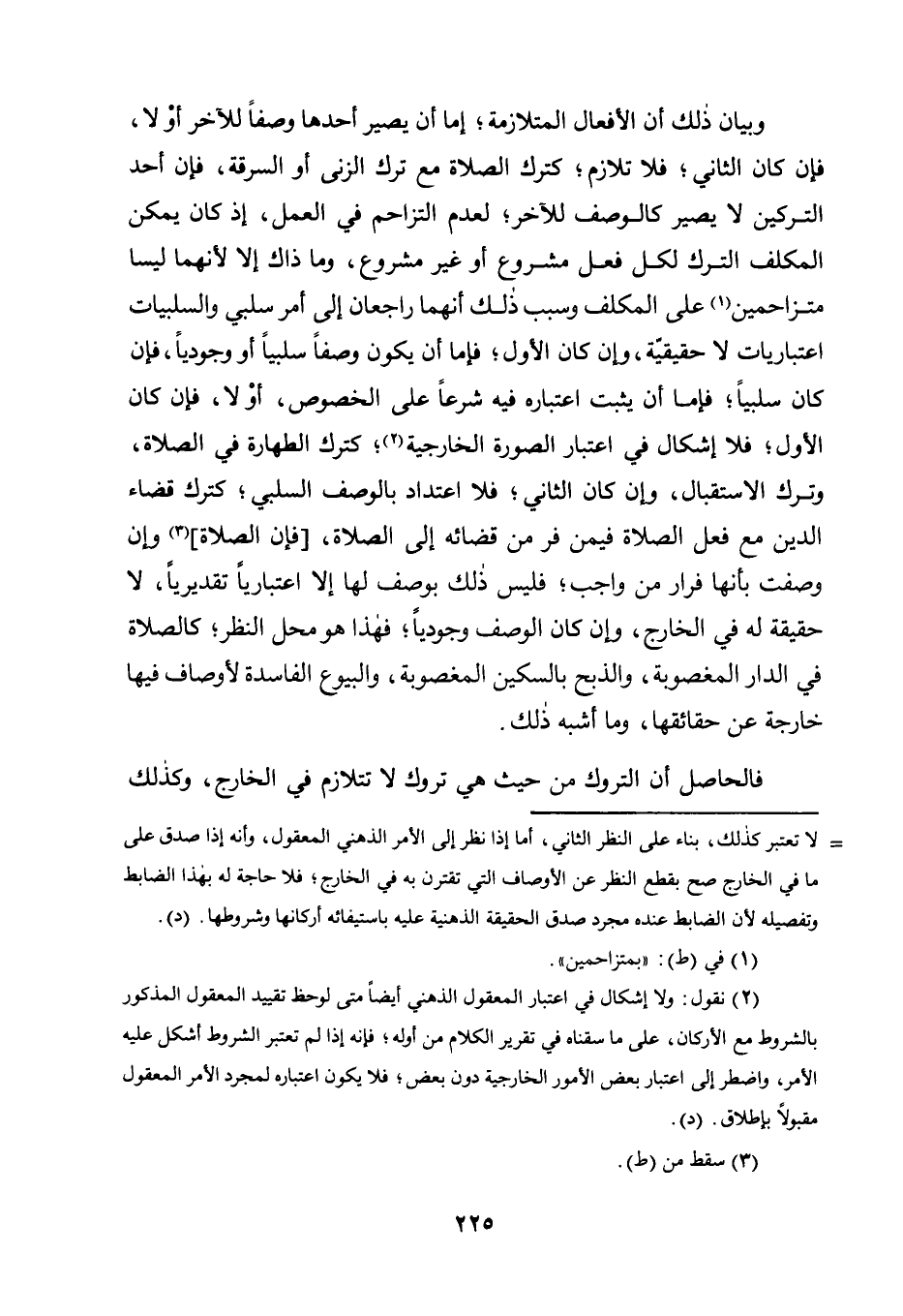 وَبَيَانُ ذَلِكَ أَنَّ الْأَفْعَالَ الْمُتَلَازِمَةَ؛ إِمَّا أَنْ يَصِيرَ أَحَدُهَا وَصْفًا لِلْآخَرِ أَوْ لَا، فَإِنْ كَانَ الثَّانِي؛ فَلَا تَلَازُمَ؛ كَتَرْكِ الصَّلَاةِ مَعَ تَرْكِ الزِّنَى أَوِ السَّرِقَةِ، فَإِنَّ أَحَدَ التَّرْكَيْنِ لَا يَصِيرُ كَالْوَصْفِ لِلْآخَرِ؛ لِعَدَمِ التَّزَاحُمِ فِي الْعَمَلِ، إِذْ كَانَ يُمْكِنُ الْمُكَلَّفَ التَّرْكُ لِكُلِّ فِعْلٍ مَشْرُوعٍ أَوْ غَيْرِ مَشْرُوعٍ، وَمَا ذَاكَ إِلَّا لِأَنَّهُمَا لَيْسَا مُتَزَاحِمَيْنِ1 عَلَى الْمُكَلَّفِ وَسَبَبُ ذَلِكَ أَنَّهُمَا رَاجِعَانِ إِلَى أَمْرٍ سَلْبِيٍّ وَالسَّلْبِيَّاتُ اعْتِبَارِيَّاتٌ لَا حَقِيقِيَّةٌ، وَإِنْ كَانَ الْأَوَّلُ؛ فَإِمَّا أَنْ يَكُونَ وَصْفًا سَلْبِيًّا أَوْ وُجُودِيًّا، فَإِنْ كَانَ سَلْبِيًّا؛ فَإِمَّا أَنْ يَثْبُتَ اعْتِبَارُهُ فِيهِ شَرْعًا عَلَى الْخُصُوصِ، أَوْ لَا، فَإِنْ كَانَ الْأَوَّلُ؛ فَلَا إِشْكَالَ فِي اعْتِبَارِ الصُّورَةِ الْخَارِجِيَّةِ2؛ كَتَرْكِ الطَّهَارَةِ فِي الصَّلَاةِ، وَتَرْكِ الِاسْتِقْبَالِ، وَإِنْ كَانَ الثَّانِي؛ فَلَا اعْتِدَادَ بِالْوَصْفِ السَّلْبِيِّ؛ كَتَرْكِ قَضَاءِ الدَّيْنِ مَعَ فِعْلِ الصَّلَاةِ فِيمَنْ فَرَّ مِنْ قَضَائِهِ إِلَى الصَّلَاةِ، [فَإِنَّ الصَّلَاةَ] 3 وَإِنْ وُصِفَتْ بِأَنَّهَا فِرَارٌ مِنْ وَاجِبٍ؛ فَلَيْسَ ذَلِكَ بِوَصْفٍ لَهَا إِلَّا اعْتِبَارِيًّا تَقْدِيرِيًّا، لَا حَقِيقَةَ لَهُ فِي الْخَارِجِ، وَإِنْ كَانَ الْوَصْفُ وُجُودِيًّا؛ فَهَذَا هُوَ مَحَلُّ النَّظَرِ؛ كَالصَّلَاةِ فِي الدَّارِ الْمَغْصُوبَةِ، وَالذَّبْحِ بِالسِّكِّينِ الْمَغْصُوبَةِ، وَالْبُيُوعِ الْفَاسِدَةِ لِأَوْصَافٍ فِيهَا خَارِجَةٍ عَنْ حَقَائِقِهَا، وَمَا أَشْبَهَ ذَلِكَ.