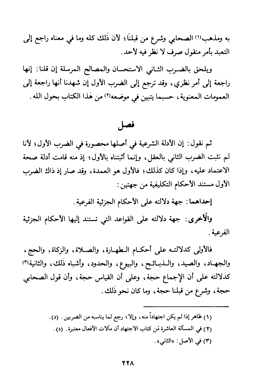 فَالْأُولَى كَدَلَالَتِهِ عَلَى أَحْكَامِ الطَّهَارَةِ، وَالصَّلَاةِ، وَالزَّكَاةِ، وَالْحَجِّ، وَالْجِهَادِ، وَالصَّيْدِ، وَالذَّبَائِحِ، وَالْبُيُوعِ، وَالْحُدُودِ، وَأَشْبَاهِ ذَلِكَ، وَالثَّانِيَةُ3 كَدَلَالَتِهِ عَلَى أَنَّ الْإِجْمَاعَ حُجَّةٌ، وَعَلَى أَنَّ الْقِيَاسَ حُجَّةٌ، وَأَنَّ قَوْلَ الصَّحَابِيِّ حُجَّةٌ، وَشَرْعَ مِنْ قَبْلَنَا حُجَّةٌ، وَمَا كَانَ نحو ذلك.