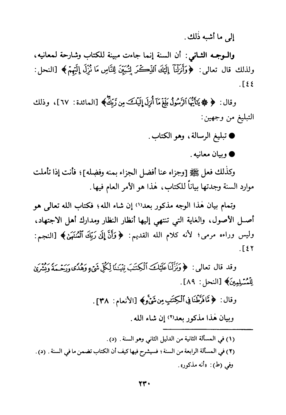 أَنَّ السُنَّةَ إِنَّمَا جَاءَتْ مُبِيِّنَةً لِلْكِتَابِ وَشَارِحَةً لِمَعَانِيهِ، وَلِذَلِكَ قَالَ تَعَالَى: {وَأَنْزَلْنَا إِلَيْكَ الذِّكْرَ لِتُبَيِّنَ لِلنَّاسِ مَا نُزِّلَ إِلَيْهِمْ} [النَّحْلِ: 44] .