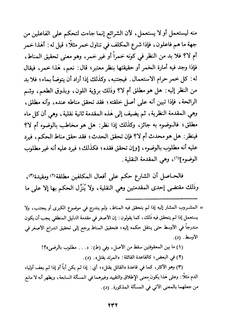 مِنْهُ لِيُسْتَعْمَلَ أَوْ لَا يُسْتَعْمَلَ، لِأَنَّ الشَّرَائِعَ إنما جاءن لِتَحْكُمَ عَلَى الْفَاعِلِينَ مِنْ جِهَةِ مَا هُمْ فَاعِلُونَ، فَإِذَا شَرَعَ الْمُكَلَّفُ فِي تَنَاوُلِ خَمْرٍ مَثَلًا؛ قِيلَ لَهُ: أَهَذَا خَمْرٌ أَمْ لَا؟ فَلَا بُدَّ مِنَ النَّظَرِ فِي كَوْنِهِ خَمْرًا أَوْ غَيْرَ خَمْرٍ، وَهُوَ مَعْنَى تَحْقِيقِ الْمَنَاطِ، فَإِذَا وُجِدَ فِيهِ أَمَارَةُ الْخَمْرِ أَوْ حَقِيقَتُهَا بِنَظَرٍ مُعْتَبَرٍ؛ قَالَ: نَعَمْ، هَذَا خَمْرٌ، فَيُقَالُ لَهُ: كُلُّ خَمْرٍ حَرَامُ الِاسْتِعْمَالِ. فَيَجْتَنِبُهُ، وَكَذَلِكَ إِذَا أَرَادَ أَنْ يَتَوَضَّأَ بِمَاءٍ؛ فَلَا بُدَّ مِنَ النَّظَرِ إِلَيْهِ: هَلْ هُوَ مُطْلَقٌ أَمْ لَا؟ وَذَلِكَ بِرُؤْيَةِ اللَّوْنِ، وَبِذَوْقِ الطَّعْمِ وَشَمِّ الرَّائِحَةِ، فَإِذَا تَبَيَّنَ أَنَّهُ عَلَى أَصْلِ خِلْقَتِهِ؛ فَقَدْ تَحَقَّقَ مَنَاطُهُ عِنْدَهُ، وَأَنَّهُ مُطْلَقٌ، وَهِىَ الْمُقَدِّمَةُ النَّظَرِيَّةُ، ثُمَّ يُضِيفُ إِلَى هَذِهِ الْمُقَدِّمَةِ ثَانِيَةً نَقْلِيَّةً، وَهِيَ أَنَّ كُلَّ مَاءٍ مُطْلَقٍ؛ فَالْوُضُوءُ بِهِ جَائِزٌ، وَكَذَلِكَ إِذَا نَظَرَ: هَلْ هُوَ مُخَاطَبٌ بِالْوُضُوءِ أَمْ لَا؟ فَيَنْظُرُ: هَلْ هُوَ مُحْدِثٌ أَمْ لَا؟ فَإِنْ تَحَقَّقَ الْحَدَثُ؛ فَقَدْ حَقَّقَ مَنَاطَ الْحُكْمِ، فَيُرَدُّ عَلَيْهِ أَنَّهُ مَطْلُوبٌ بِالْوُضُوءِ، [وَإِنْ تَحَقَّقَ فَقْدُهُ؛ فَكَذَلِكَ؛ فَيُرَدُّ عَلَيْهِ أَنَّهُ غَيْرُ مَطْلُوبِ الْوُضُوءِ] 1، وَهَى الْمُقَدِّمَةُ النَّقْلِيَّةُ.