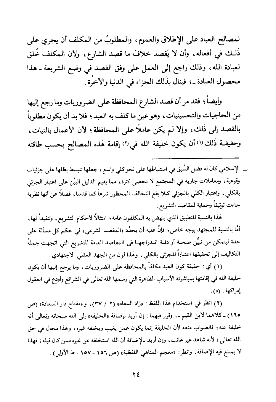 1 أي: حقيقة كون العبد مكلفا بالمحافظة على الضروريات، وما يرجع إليها أن يكون خليفة الله في إقامتها بمباشرته الأسباب الظاهرة التي رسمها الله تعالى في الشرائع وأودع في العقول إدراكها. "د".