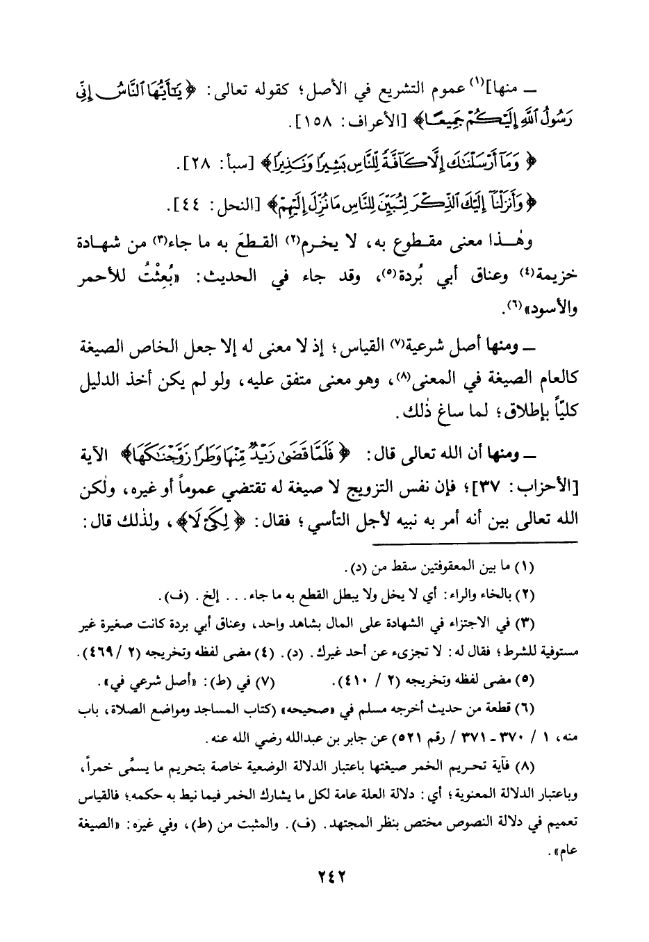 - مِنْهَا] 1 عُمُومُ التَّشْرِيعِ فِي الْأَصْلِ؛ كَقَوْلِهِ تَعَالَى: {يَا أَيُّهَا النَّاسُ إِنِّي رَسُولُ اللَّهِ إِلَيْكُمْ جَمِيعًا} [الْأَعْرَافِ: 158] .