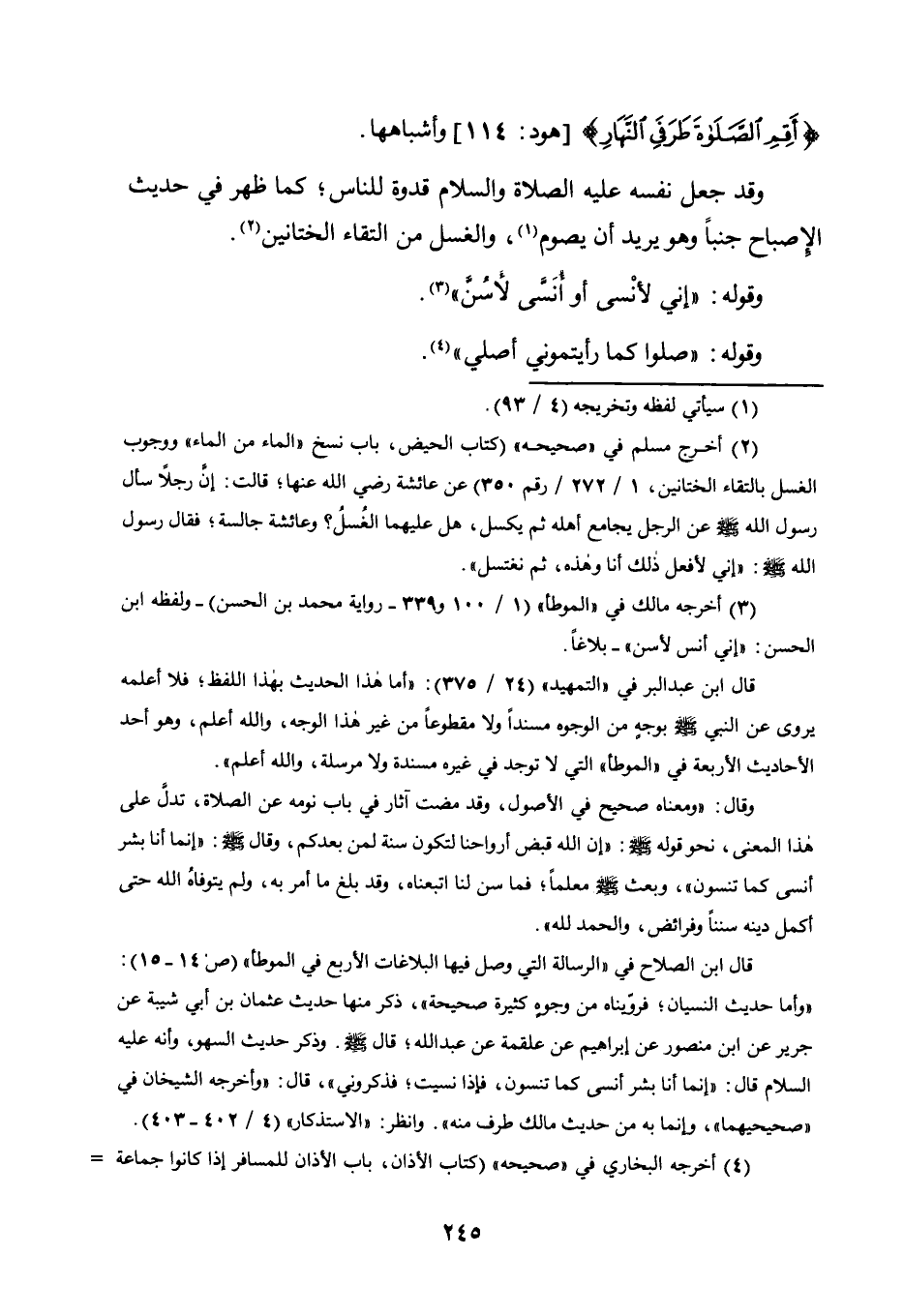 وقال: "ومعناه صحيح في الأصول، وقد مضت آثار في باب نومه عن الصلاة، تدل على هذا المعنى، نحو قوله صلى الله عليه وسلم: "إن الله قبض أرواحنا لتكون سنة لمن بعدكم، وقال صلى الله عليه وسلم: "إنما أنا بشر أنسى كما تنسون"، وبعث صلى الله عليه وسلم معلما؛ فما سن لنا اتبعناه، وقد بلغ ما أمر به، ولم يتوفاه الله حتى أكمل دينه سننا وفرائض، والحمد لله".