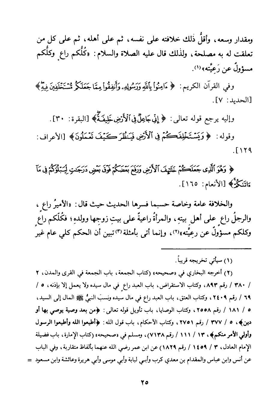 وَمِقْدَارِ وُسْعِهِ، وَأَقَلُّ ذَلِكَ خِلَافَتُهُ عَلَى نَفْسِهِ، ثُمَّ عَلَى أَهْلِهِ، ثُمَّ عَلَى كُلِّ مَنْ تَعَلَّقَتْ لَهُ بِهِ مَصْلَحَةٌ، وَلِذَلِكَ قَالَ عَلَيْهِ الصَّلَاةُ وَالسَّلَامُ: "كُلُّكُمْ رَاعٍ وَكُلُّكُمْ مَسْئُولٌ عَنْ رَعِيَّتِهِ" 1.