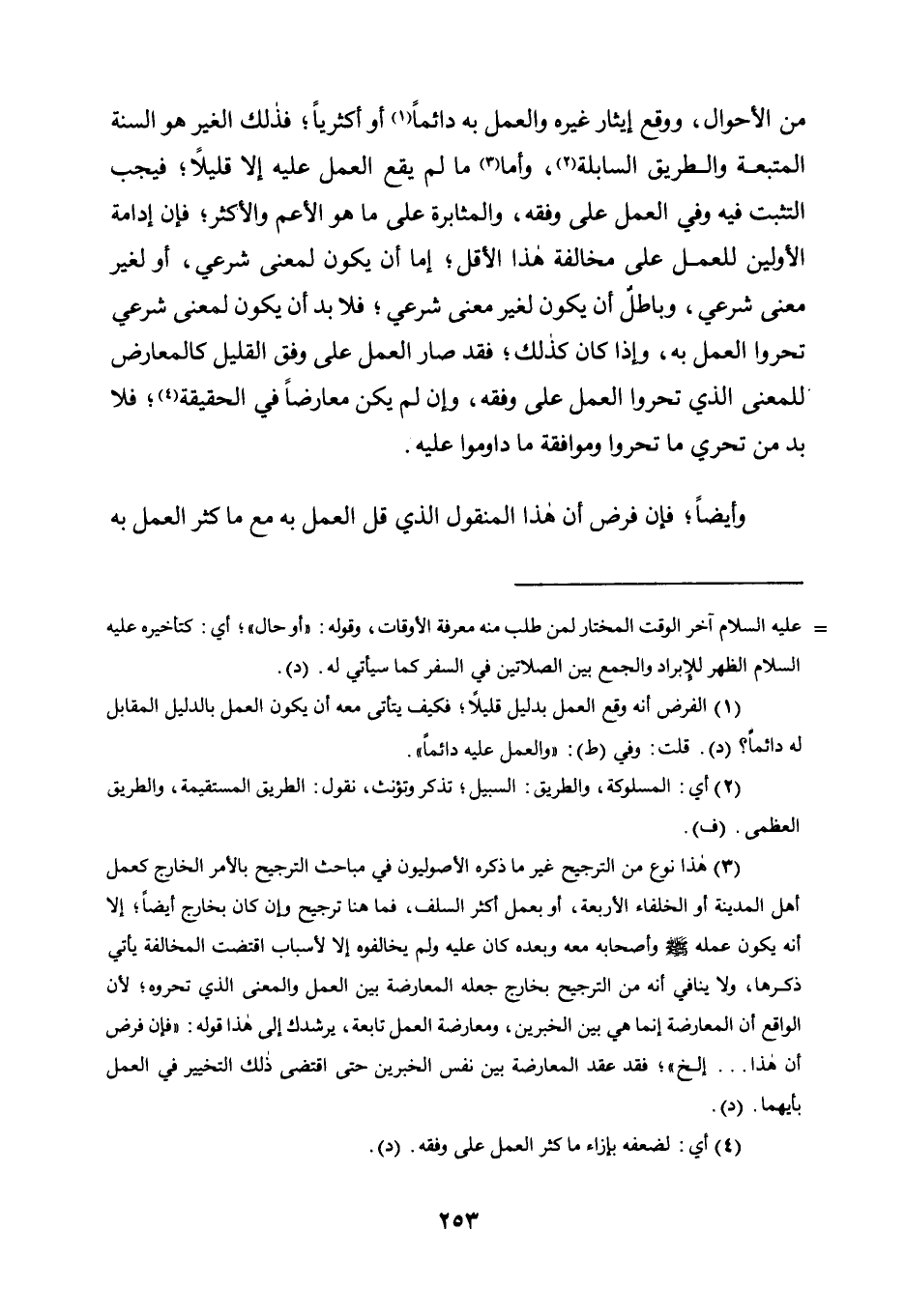 3 هذا نوع من الترجيح غير ما ذكره الأصوليون في مباحث الترجيح بالأمر الخارج كعمل أهل المدينة أو الخلفاء الأربعة، أو بعمل أكثر السلف، فما هنا ترجيح وإن كان بخارج أيضا؛ إلا أنه يكون عمله صلى الله عليه وسلم وأصحابه معه وبعده كان عليه ولم يخالفوه إلا لأسباب اقتضت المخالفة يأتي ذكرها، ولا ينافي أنه من الترجيح بخارج جعله المعارضة بين العمل والمعنى الذي تحروه؛ لأن الواقع أن المعارضة إنما هي بين الخبرين، ومعارضة العمل تابعة، يرشدك إلى هذا قوله: "فإن فرض أن هذا ... إلخ"؛ فقد عقد المعارضة بين نفس الخبرين حتى اقتضى ذلك التخيير في العمل بأيهما. "د".