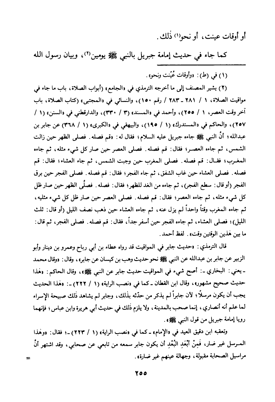 كَمَا جَاءَ فِي حَدِيثِ إِمَامَةِ جِبْرِيلَ بِالنَّبِيِّ صَلَّى اللَّهُ عَلَيْهِ وَسَلَّمَ يَوْمَيْنِ2، وَبَيَانِ رَسُولِ اللَّهِ