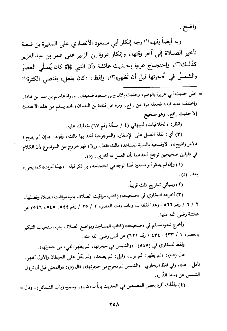 وَبِهِ أَيْضًا يُفْهَمُ1 وَجْهُ إِنْكَارِ أَبِي مَسْعُودٍ الْأَنْصَارِيِّ عَلَى الْمُغِيرَةِ بْنِ شُعْبَةَ تَأْخِيرَ الصَّلَاةِ إِلَى آخِرِ وَقْتِهَا، وَإِنْكَارِ عُرْوَةَ بْنِ الزُّبَيْرِ عَلَى عُمَرَ بْنِ عَبْدِ الْعَزِيزِ كَذَلِكَ2، وَاحْتِجَاجِ عُرْوَةَ بِحَدِيثِ عَائِشَةَ "أَنَّ النَّبِيَّ صَلَّى اللَّهُ عَلَيْهِ وَسَلَّمَ كَانَ يُصَلِّي الْعَصْرَ وَالشَّمْسُ فِي حُجْرَتِهَا قَبْلَ أَنْ تَظْهَرَ"3، وَلَفَظُ: "كَانَ يفعل" يقتضي الكثرة4