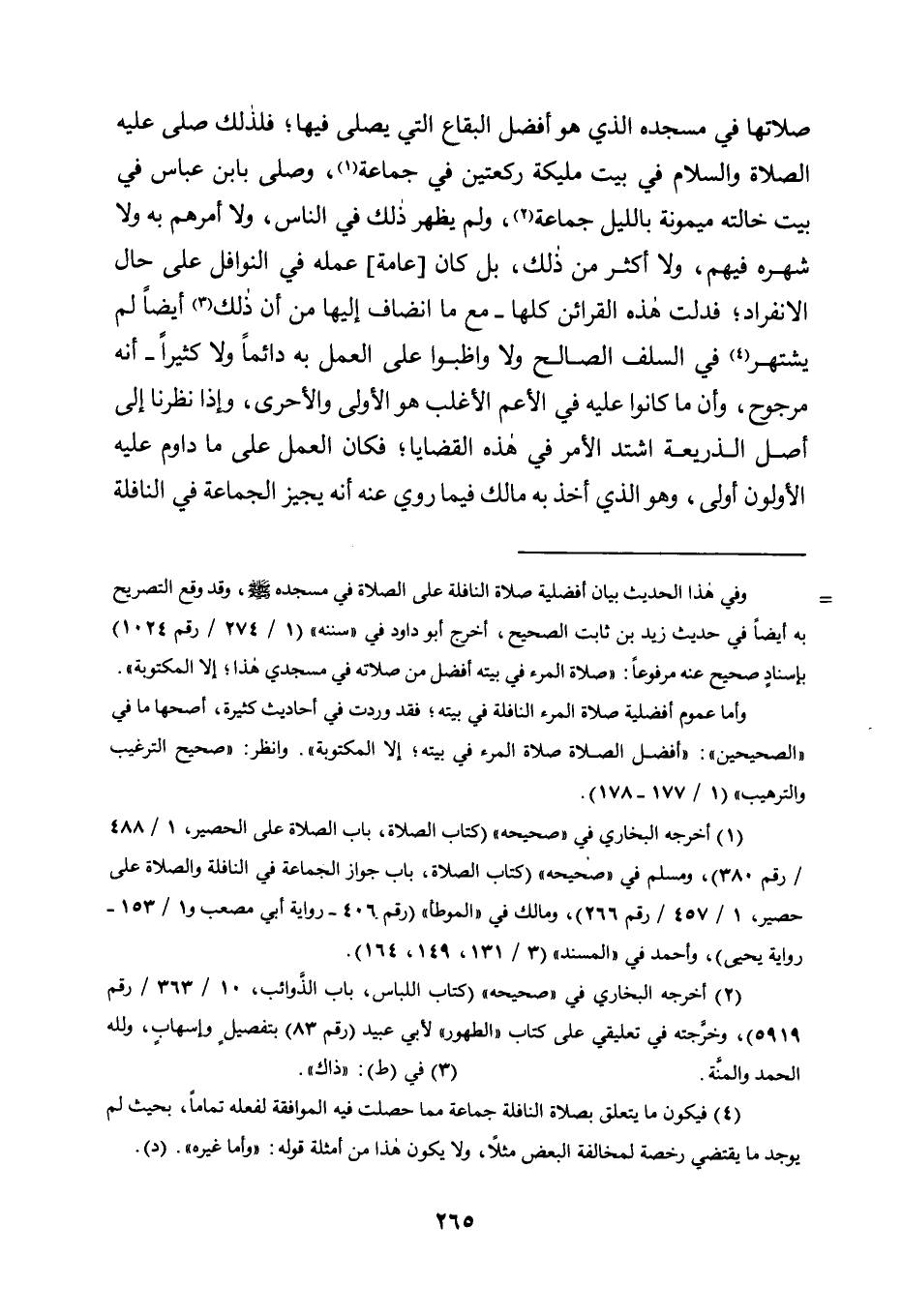 صَلَاتِهَا فِي مَسْجِدِهِ الَّذِي هُوَ أَفْضَلُ الْبِقَاعِ الَّتِي يُصلى فِيهَا؛ فَلِذَلِكَ صَلَّى عَلَيْهِ الصَّلَاةُ وَالسَّلَامُ فِي بَيْتِ مُلَيْكَةَ رَكْعَتَيْنِ فِي جَمَاعَةٍ1، وَصَلَّى بِابْنِ عَبَّاسٍ فِي بَيْتِ خَالَتِهِ مَيْمُونَةَ بِاللَّيْلِ جَمَاعَةً2، وَلَمْ يُظْهِرْ ذَلِكَ فِي النَّاسِ، وَلَا أَمَرَهُمْ بِهِ وَلَا شَهَرَهُ فِيهِمْ، وَلَا أَكْثَرَ مِنْ ذَلِكَ، بَلْ كَانَ [عَامَّةُ] عَمَلِهِ فِي النَّوَافِلِ عَلَى حَالِ الِانْفِرَادِ؛ فَدَلَّتْ هَذِهِ الْقَرَائِنُ كُلُّهَا -مَعَ مَا انْضَافَ إِلَيْهَا مِنْ أَنَّ ذَلِكَ3 أَيْضًا لَمْ يُشْتَهَرْ4 فِي السَّلَفِ الصَّالِحِ وَلَا وَاظَبُوا عَلَى الْعَمَلِ بِهِ دَائِمًا وَلَا كَثِيرًا- أَنَّهُ مَرْجُوحٌ، وَأَنَّ مَا كَانُوا عَلَيْهِ فِي الْأَعَمِّ الْأَغْلَبِ هُوَ الْأَوْلَى وَالْأَحْرَى، وَإِذَا نَظَرْنَا إِلَى أَصْلِ الذَّرِيعَةِ اشْتَدَّ الْأَمْرُ فِي هَذِهِ الْقَضَايَا؛ فَكَانَ الْعَمَلُ عَلَى مَا دَاوَمَ عَلَيْهِ الْأَوَّلُونَ أَوْلَى، وَهُوَ الَّذِي أَخَذَ بِهِ مَالِكٌ فِيمَا رُوِيَ عَنْهُ أَنَّهُ يُجِيزُ الجماعة في النافلة