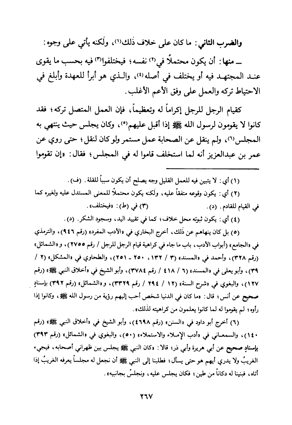 كَقِيَامِ الرَّجُلِ لِلرَّجُلِ إِكْرَامًا لَهُ وَتَعْظِيمًا، فَإِنَّ الْعَمَلَ الْمُتَّصِلَ تَرْكُهُ؛ فَقَدْ كَانُوا لَا يَقُومُونَ لِرَسُولِ اللَّهِ صَلَّى اللَّهُ عَلَيْهِ وَسَلَّمَ إِذَا أَقْبَلَ عَلَيْهِمْ5، وَكَانَ يَجْلِسُ حَيْثُ يَنْتَهِي بِهِ الْمَجْلِسُ6، وَلَمْ يُنْقَلْ عَنِ الصَّحَابَةِ عَمَلٌ مُسْتَمِرٌّ وَلَوْ كَانَ لَنُقِلَ؛ حَتَّى رُوِيَ عَنْ عُمَرَ بْنِ عَبْدِ الْعَزِيزِ أَنَّهُ لَمَّا اسْتُخْلِفَ قَامُوا له في المجلس؛ فقال: "إن تقوموا