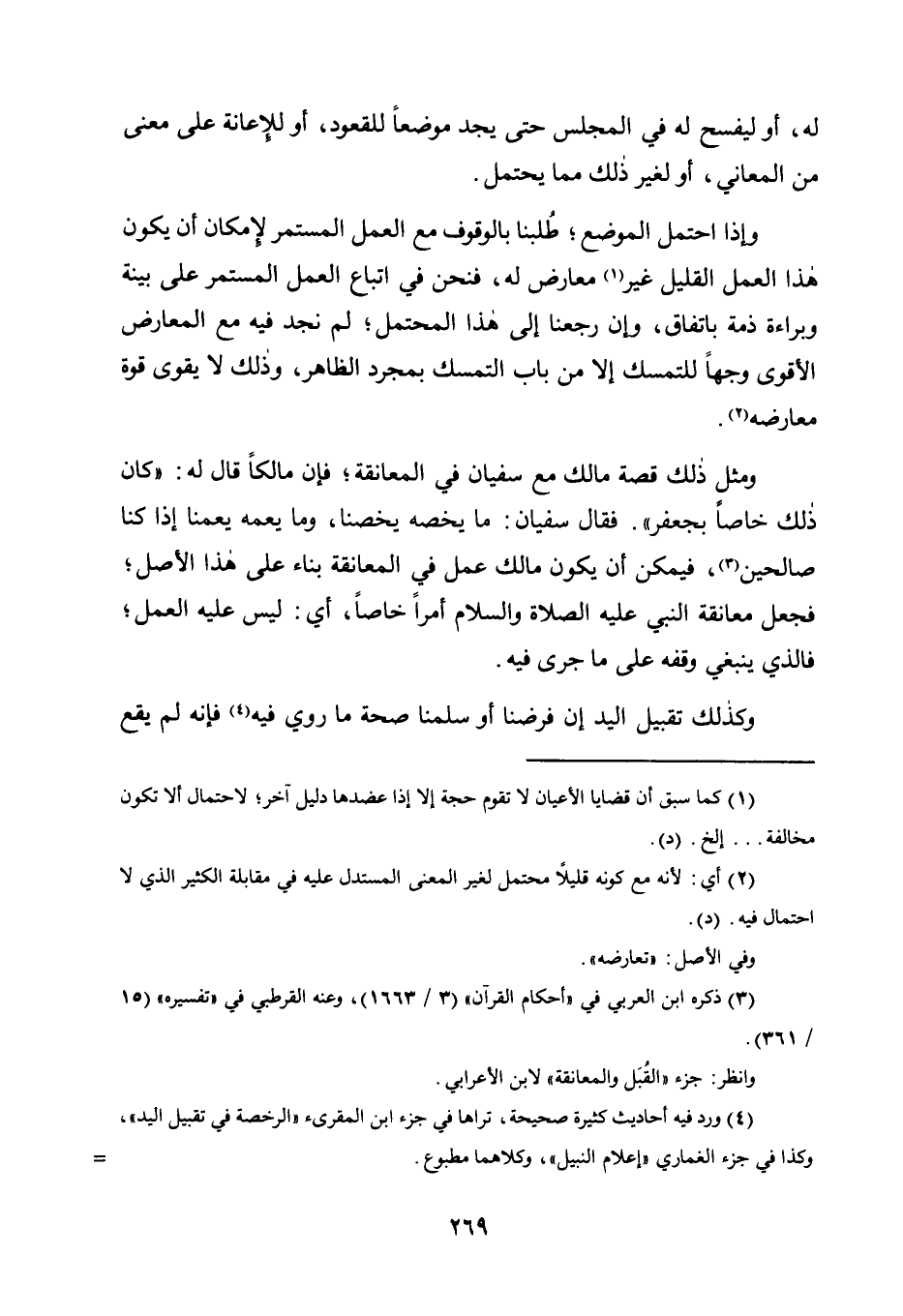 وَمِثْلُ ذَلِكَ قِصَّةُ مَالِكٍ مَعَ سُفْيَانَ فِي الْمُعَانَقَةِ؛ فَإِنَّ مَالِكًا قَالَ لَهُ: "كَانَ ذَلِكَ خَاصًّا بِجَعْفَرٍ". فَقَالَ سُفْيَانُ: مَا يَخُصُّهُ يَخُصُّنَا، وَمَا يَعُمُّهُ يَعُمُّنَا إِذَا كُنَّا صَالِحِينَ3، فَيُمْكِنُ أَنْ يَكُونَ مَالِكٌ عَمِلَ فِي الْمُعَانَقَةِ بِنَاءً عَلَى هَذَا الْأَصْلِ؛ فَجَعَلَ مُعَانَقَةَ النَّبِيِّ عَلَيْهِ الصَّلَاةُ وَالسَّلَامُ أَمْرًا خَاصًّا، أَيْ: لَيْسَ عَلَيْهِ الْعَمَلُ؛ فَالَّذِي يَنْبَغِي وَقْفُهُ عَلَى مَا جَرَى فِيهِ.