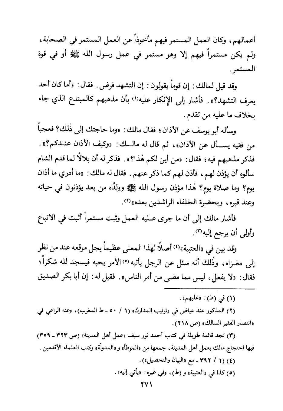3 تجد قائمة طويلة في كتاب أحمد نور سيف "عمل أهل المدينة" "ص323-359" فيها احتجاج مالك بعمل أهل المدينة، جمعها من "الموطأ" و"المدونة" وكتب العلماء الأقدمين.