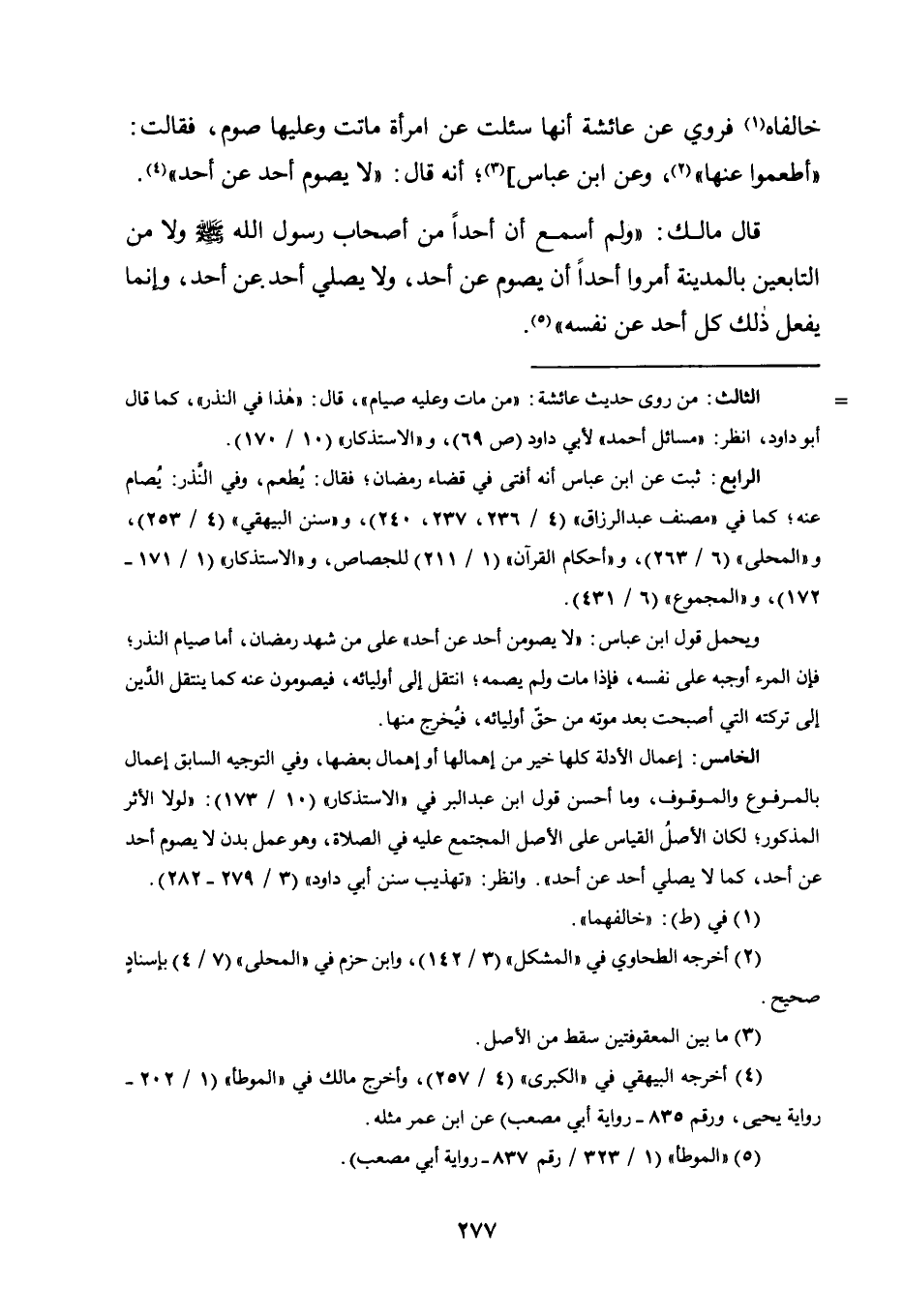 الخامس: إعمال الأدلة كلها خير من إهمالها أو إهمال بعضها، وفي التوجيه السابق إعمال بالمرفوع والموقوف، وما أحسن قول ابن عبد البر في "الاستذكار" "10/ 173": "لولا الأثر المذكور؛ لكان الأصل القياس على الأصل المجتمع عليه في الصلاة، وهو عمل بدن لا يصوم أحد عن أحد، كما لا يصلي أحد عن أحد". وانظر: "تهذيب سنن أبي داود" "3/ 279-282".