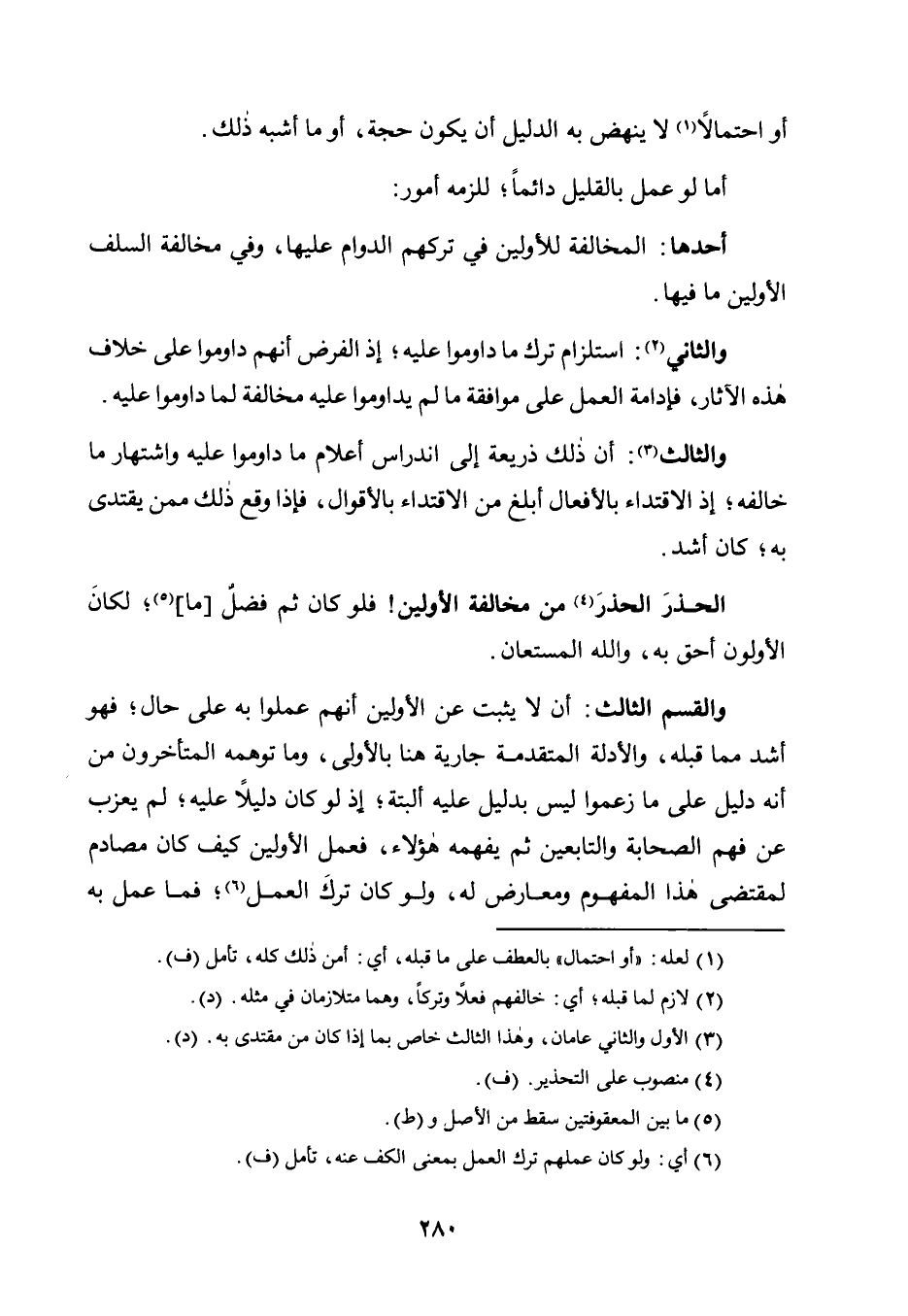 وَالْقِسْمُ الثَّالِثُ: أَنْ لَا يَثْبُتَ عَنِ الْأَوَّلِينَ أَنَّهُمْ عَمِلُوا بِهِ عَلَى حَالٍ؛ فَهُوَ أَشَدُّ مِمَّا قَبْلَهُ، وَالْأَدِلَّةُ الْمُتَقَدِّمَةُ جَارِيَةٌ هُنَا بِالْأَوْلَى، وَمَا تَوَهَّمَهُ الْمُتَأَخِّرُونَ مِنْ أَنَّهُ دَلِيلٌ عَلَى مَا زَعَمُوا لَيْسَ بِدَلِيلٍ عَلَيْهِ أَلْبَتَّةَ؛ إِذْ لَوْ كَانَ دَلِيلًا عَلَيْهِ؛ لَمْ يَعْزُبْ عَنْ فَهْمِ الصَّحَابَةِ وَالتَّابِعِينَ ثُمَّ يَفْهَمُهُ هَؤُلَاءِ، فَعَمَلُ الْأَوَّلِينَ كَيْفَ كَانَ مُصَادِمٌ لِمُقْتَضَى هَذَا الْمَفْهُومِ وَمُعَارِضٌ لَهُ، وَلَوْ كَانَ تَرْكَ الْعَمَلِ6؛ فَمَا عَمِلَ بِهِ