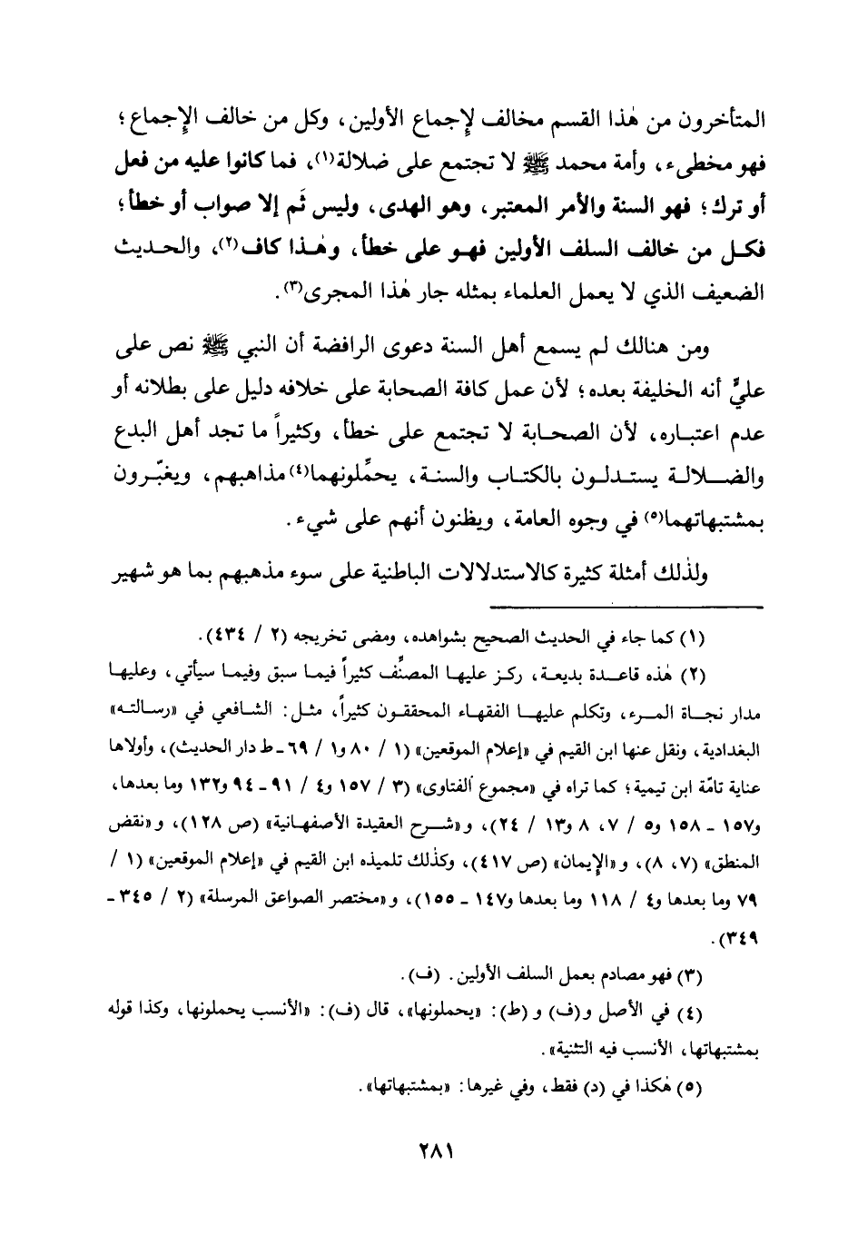 وَمِنْ هُنَالِكَ لَمْ يَسْمَعْ أَهْلُ السُّنَّةِ دَعْوَى الرَّافِضَةِ أَنَّ النَّبِيَّ صَلَّى اللَّهُ عَلَيْهِ وَسَلَّمَ نَصَّ عَلَى عَلِيٍّ أَنَّهُ الْخَلِيفَةُ بَعْدَهُ؛ لِأَنَّ عَمَلَ كَافَّةِ الصَّحَابَةِ عَلَى خِلَافِهِ دَلِيلٌ عَلَى بُطْلَانِهِ أَوْ عَدَمِ اعْتِبَارِهِ، لِأَنَّ الصَّحَابَةَ لَا تَجْتَمِعُ عَلَى خَطَأٍ، وَكَثِيرًا مَا تَجِدُ أَهْلَ الْبِدَعِ وَالضَّلَالَةِ يَسْتَدِلُّونَ بِالْكِتَابِ وَالسُّنَّةِ، يُحَمِّلُونَهُمَا4 مَذَاهِبَهُمْ، وَيُغَبِّرُونَ بِمُشْتَبِهَاتِهِمَا5 فِي وُجُوهِ الْعَامَّةِ، وَيَظُنُّونَ أَنَّهُمْ عَلَى شيء.