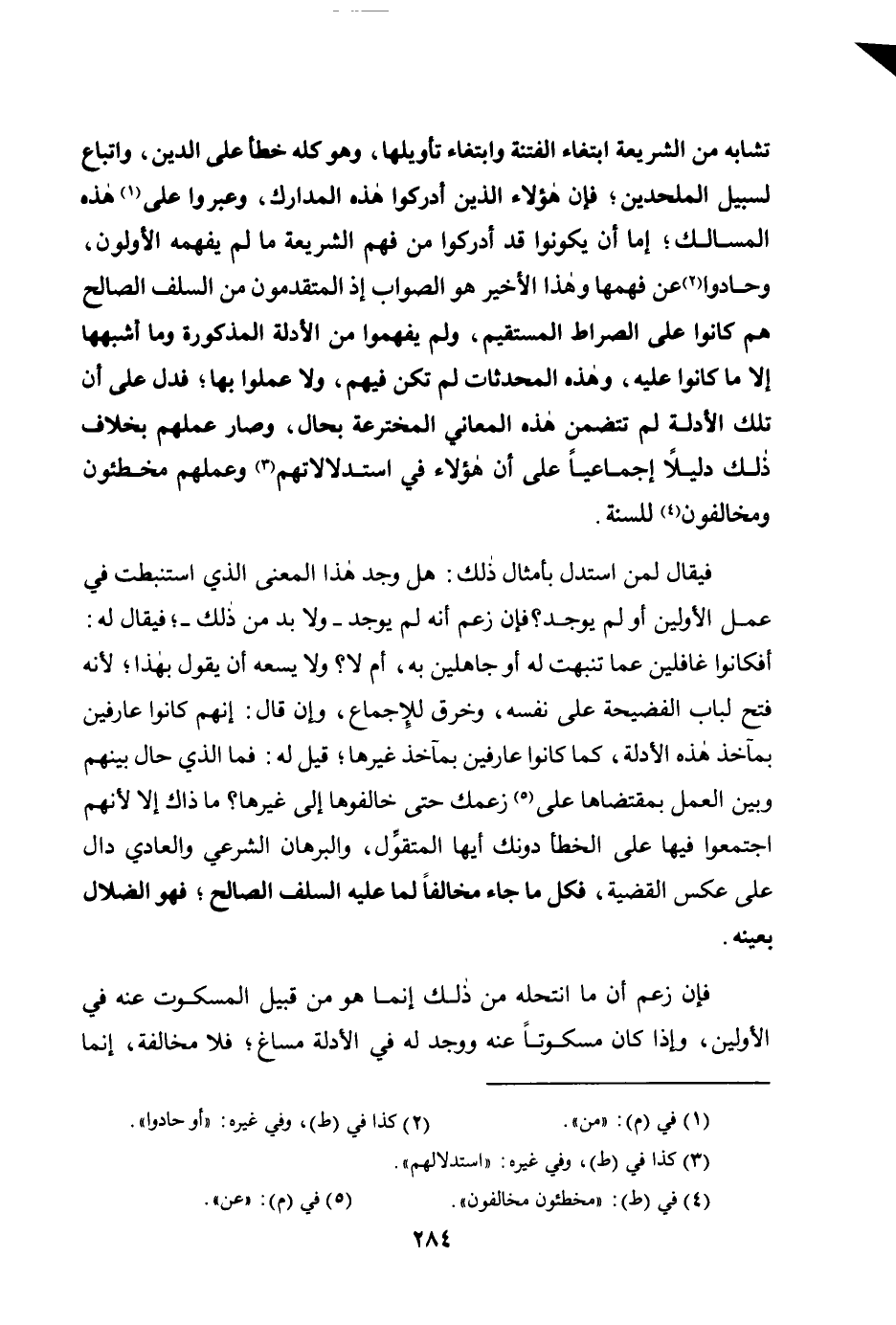 تَشَابَهَ مِنَ الشَّرِيعَةِ ابْتِغَاءَ الْفِتْنَةِ وَابْتِغَاءَ تَأْوِيلِهَا، وَهُوَ كُلُّهُ خَطَأٌ عَلَى الدِّينِ، وَاتِّبَاعٌ لِسَبِيلِ الْمُلْحِدِينَ؛ فَإِنَّ هَؤُلَاءِ الَّذِينَ أَدْرَكُوا هَذِهِ الْمَدَارِكَ، وَعَبَرُوا عَلَى1 هَذِهِ الْمَسَالِكِ؛ إِمَّا أَنْ يَكُونُوا قَدْ أَدْرَكُوا مِنْ فَهْمِ الشَّرِيعَةِ مَا لَمْ يفهمه الأولون، وحادوا2 عَنْ فَهْمِهَا وَهَذَا الْأَخِيرُ هُوَ الصَّوَابُ إِذِ الْمُتَقَدِّمُونَ مِنَ السَّلَفِ الصَّالِحِ هُمْ كَانُوا عَلَى الصِّرَاطِ الْمُسْتَقِيمِ، وَلَمْ يَفْهَمُوا مِنَ الْأَدِلَّةِ الْمَذْكُورَةِ وَمَا أَشْبَهَهَا إِلَّا مَا كَانُوا عَلَيْهِ، وَهَذِهِ الْمُحْدَثَاتُ لَمْ تَكُنْ فِيهِمْ، وَلَا عَمِلُوا بِهَا؛ فَدَلَّ عَلَى أَنَّ تِلْكَ الْأَدِلَّةَ لَمْ تَتَضَمَّنْ هَذِهِ الْمَعَانِيَ الْمُخْتَرَعَةَ بِحَالٍ، وَصَارَ عَمَلُهُمْ بِخِلَافِ ذَلِكَ دَلِيلًا إِجْمَاعِيًّا عَلَى أَنَّ هَؤُلَاءِ فِي استدلالاتهم3 وَعَمَلِهِمْ مُخْطِئُونَ وَمُخَالِفُونَ4 لِلسُّنَّةِ.