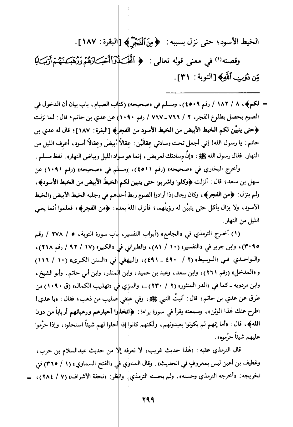 1 أخرج الترمذي في "الجامع" "أبواب التفسير، باب سورة التوبة، 5/ 278/ رقم 3059"، وابن جرير في "التفسير" "10/ 81"، والطبراني في "الكبير" "17/ 92/ رقم 218"، والواحدي في "الوسيط" "2/ 490-491"، والبيهقي في "السنن الكبرى" "10/ 116" و"المدخل" "رقم 261"، وابن سعد، وعبد بن حميد، وابن المنذر، وابن أبي حاتم، وأبو الشيخ، وابن مردويه -كما في "الدر المنثور" "2/ 230"- المزي في "تهذيب الكمال" "ق1090" من طرق عن عدي بن حاتم؛ قال: أتيت النبي صلى الله عليه وسلم، وفي عنقي صليب من ذهب، فقال: "يا عدي! اطرح عنك هذ الوثن"، وسمعته يقرأ في سورة براءة: {اتَّخَذُوا أَحْبَارَهُمْ وَرُهْبَانَهُمْ أَرْبَابًا مِنْ دُونِ اللَّهِ} ، قال: "أما إنهم لم يكونوا يعبدونهم، ولكنهم كانوا إذا أحلوا لهم شيئا استحلوه، وإذا حرموا عليهم شيئا حرموه".