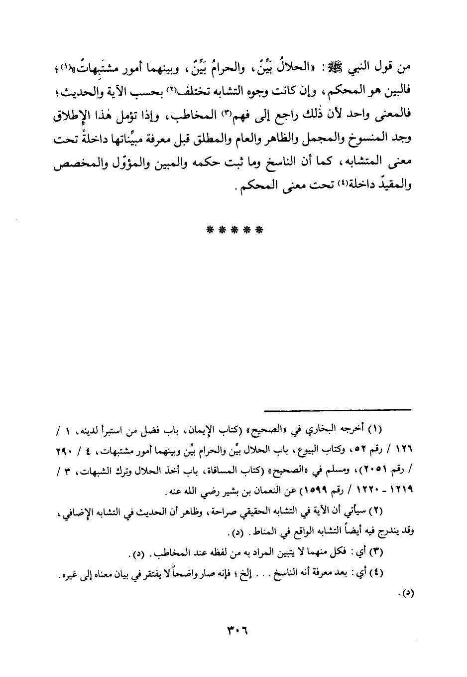 مِنْ قَوْلِ النَّبِيِّ صَلَّى اللَّهُ عَلَيْهِ وَسَلَّمَ: "الْحَلَالُ بَيِّنٌ، وَالْحَرَامُ بَيِّنٌ، وَبَيْنَهُمَا أُمُورٌ مُشْتَبِهَاتٌ" 1؛ فَالْبَيِّنُ هُوَ الْمُحْكَمُ، وَإِنْ كَانَتْ وُجُوهُ التَّشَابُهِ تَخْتَلِفُ2 بِحَسَبِ الْآيَةِ وَالْحَدِيثِ؛ فَالْمَعْنَى وَاحِدٌ لِأَنَّ ذَلِكَ رَاجِعٌ إِلَى فَهْمِ3 الْمُخَاطَبِ، وَإِذَا تُؤُمِّلَ هَذَا الْإِطْلَاقُ وُجِدَ الْمَنْسُوخُ وَالْمُجْمَلُ وَالظَّاهِرُ وَالْعَامُّ وَالْمُطْلَقُ قَبْلَ مَعْرِفَةِ مُبَيِّنَاتِهَا دَاخِلَةً تَحْتَ مَعْنَى الْمُتَشَابِهِ، كَمَا أَنَّ النَّاسِخَ وَمَا ثَبَتَ حُكْمُهُ وَالْمُبَيَّنُ وَالْمُؤَوَّلُ وَالْمُخَصَّصُ وَالْمُقَيَّدُ دَاخِلَةٌ4 تَحْتَ مَعْنَى المحكم.