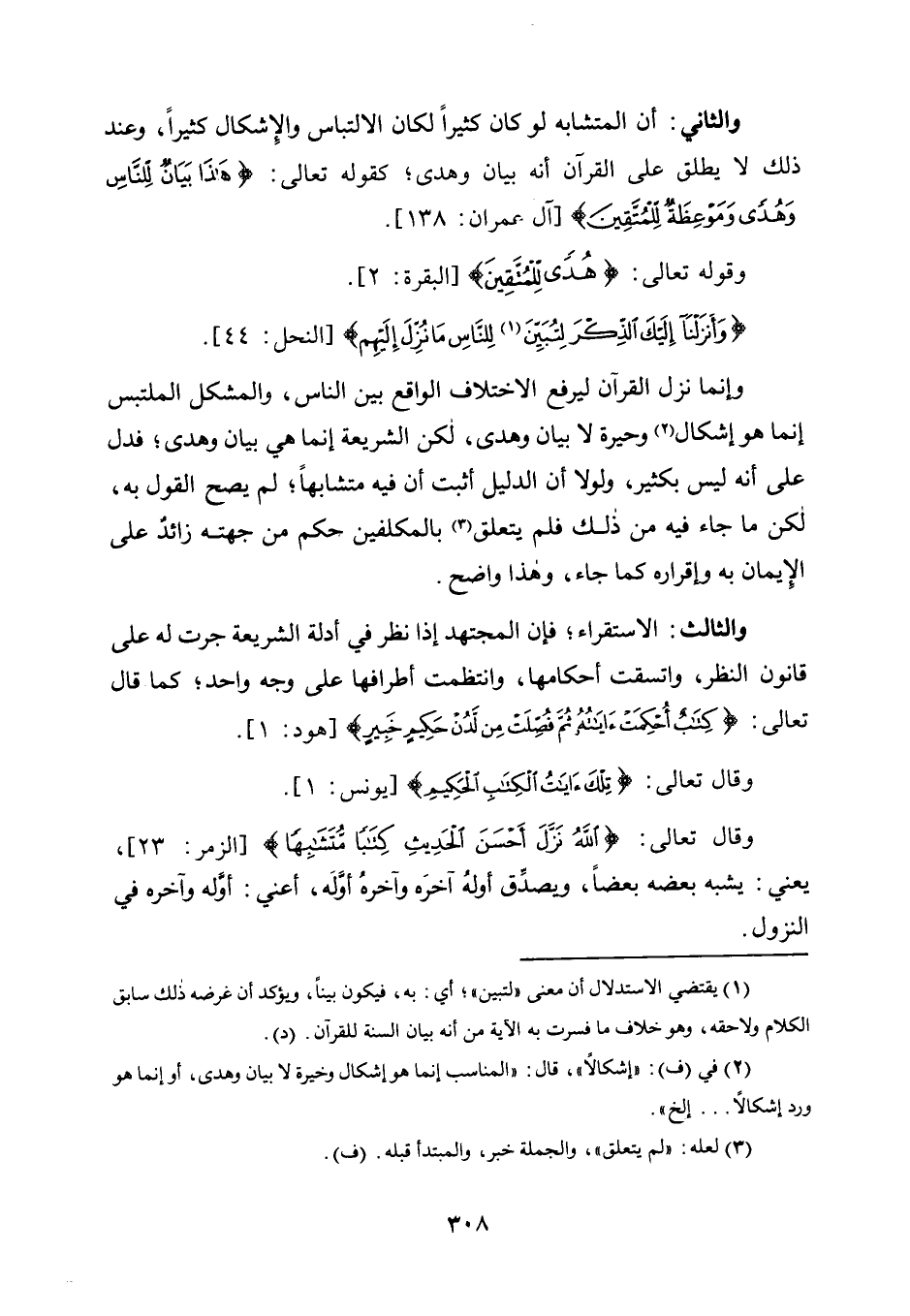 وَإِنَّمَا نَزَلَ الْقُرْآنُ لِيَرْفَعَ الِاخْتِلَافَ الْوَاقِعَ بَيْنَ النَّاسِ، وَالْمُشْكَلُ الْمُلْتَبِسُ إِنَّمَا هُوَ إِشْكَالٌ2 وَحَيْرَةٌ لَا بَيَانٌ وَهُدًى، لَكِنَّ الشَّرِيعَةَ إِنَّمَا هِيَ بَيَانٌ وَهُدًى؛ فَدَلَّ عَلَى أَنَّهُ لَيْسَ بِكَثِيرٍ، وَلَوْلَا أَنَّ الدَّلِيلَ أَثْبَتَ أَنَّ فِيهِ مُتَشَابِهًا؛ لَمْ يَصِحَّ الْقَوْلُ بِهِ، لَكِنَّ مَا جَاءَ فِيهِ مِنْ ذَلِكَ فَلَمْ يَتَعَلَّقْ3 بِالْمُكَلَّفِينَ حُكْمٌ مِنْ جِهَتِهِ زَائِدٌ عَلَى الْإِيمَانِ بِهِ وَإِقْرَارُهُ كَمَا جَاءَ، وَهَذَا وَاضِحٌ.