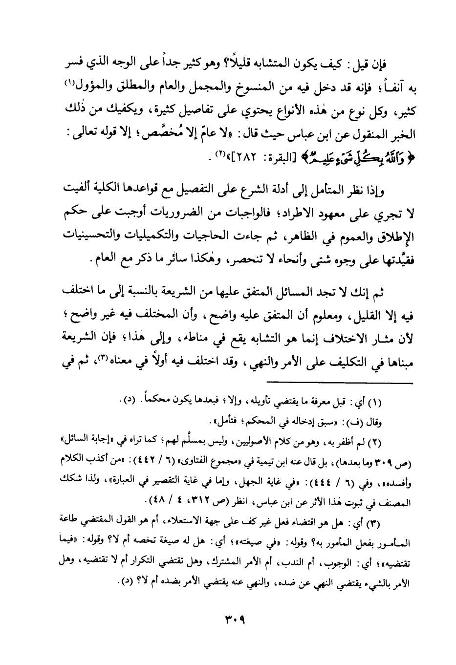 ثُمَّ إِنَّكَ لَا تَجِدَ الْمَسَائِلَ الْمُتَّفَقَ عَلَيْهَا مِنَ الشَّرِيعَةِ بِالنِّسْبَةِ إِلَى مَا اخْتُلِفَ فِيهِ إِلَّا الْقَلِيلَ، وَمَعْلُومٌ أَنَّ الْمُتَّفَقَ عَلَيْهِ وَاضِحٌ، وَأَنَّ الْمُخْتَلَفَ فِيهِ غَيْرُ وَاضِحٍ؛ لِأَنَّ مَثَارَ الِاخْتِلَافِ إِنَّمَا هُوَ التَّشَابُهُ يَقَعُ فِي مَنَاطِهِ، وَإِلَى هَذَا؛ فَإِنَّ الشَّرِيعَةَ مَبْنَاهَا فِي التَّكْلِيفِ عَلَى الْأَمْرِ وَالنَّهْيِ، وَقَدِ اخْتُلِفَ فِيهِ أَوَّلًا فِي مَعْنَاهُ3، ثُمَّ في