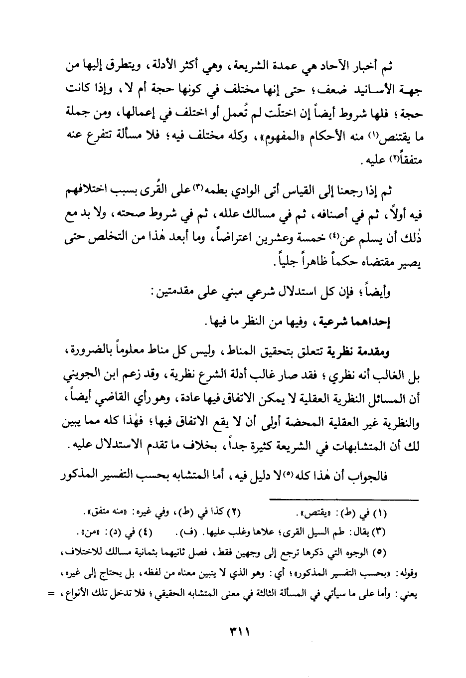5 الوجوه التي ذكرها ترجع إلى وجهين فقط، فصل ثانيهما بثمانية مسالك للاختلاف، وقوله: "بحسب التفسير المذكور"؛ أي: وهو الذي لا يتبين معناه من لفظه، بل يحتاج إلى غيره، يعني: وأما على ما سيأتي في المسألة الثالثة في معنى المتشابه الحقيقي؛ فلا تدخل تلك الأنواع، وهذا الجواب خاص بالوجه الأول من وجهي الإشكال، وسيأتي جواب الثاني في المسألة التالية حيث يقول: "وأما مسائل الخلاف وإن كثرت ... إلخ". "د".