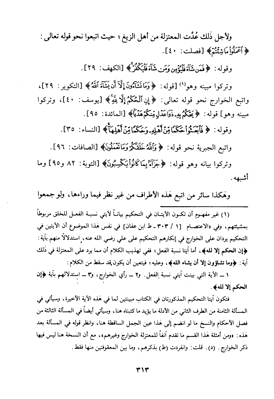 1 غير مفهوم أن تكون الآيتان في التحكيم بيانا لآيتي نسبة الفعل للخلق مربوطا بمشيئتهم، وفي "الاعتصام [1/ 303 - ط ابن عفان] في نفس هذا الموضوع أن الآيتين في التحكيم يردان على الخوارج في إنكارهم التحكيم على علي رضي الله عنه، استدلالا منهم بآية: {إِنِ الْحُكْمُ إِلَّا لِلَّه} ، أما آيتا نسبة الفعل؛ ففي تهذيب الكلام أن مما يرد على المعتزلة في ذلك آية: {وَمَا تَشَاءُونَ إِلَّا أَنْ يَشَاءَ اللَّهُ} ، وعليه؛ فيتعين أن يكون قد سقط من الكلام.