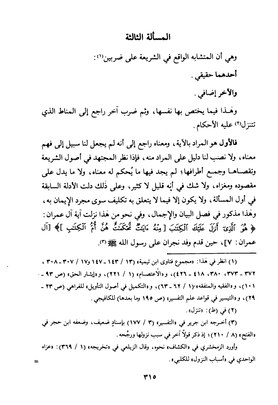 وَهِيَ أَنَّ الْمُتَشَابِهَ الْوَاقِعَ فِي الشَّرِيعَةِ عَلَى ضَرْبَيْنِ1: