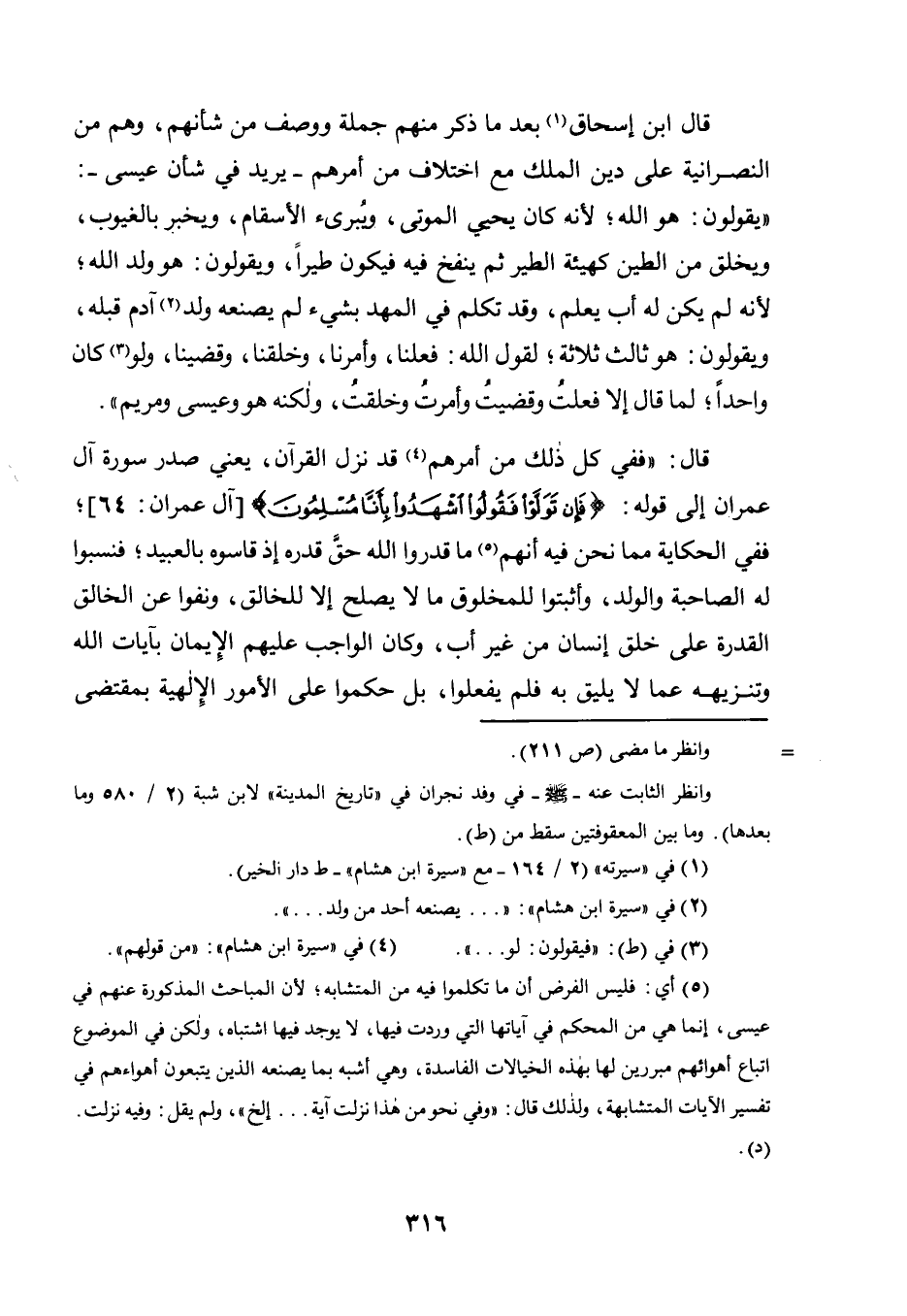 قَالَ ابْنُ إِسْحَاقَ1 بَعْدَ مَا ذَكَرَ مِنْهُمْ جُمْلَةً وَوَصَفَ مِنْ شَأْنِهِمْ، وَهُمْ مِنَ النَّصْرَانِيَّةِ عَلَى دِينِ الْمَلِكِ مَعَ اخْتِلَافٍ مِنْ أَمْرِهِمْ -يُرِيدُ فِي شَأْنِ عِيسَى-: "يَقُولُونَ: هُوَ اللَّهُ؛ لأنه كان يحيي الموتى، ويبرئ الْأَسْقَامَ، وَيُخْبِرُ بِالْغُيُوبِ، وَيَخْلُقُ مِنَ الطِّينِ كَهَيْئَةِ الطير ثم ينفخ فِيهِ فَيَكُونُ طَيْرًا، وَيَقُولُونَ: هُوَ وَلَدُ اللَّهِ؛ لِأَنَّهُ لَمْ يَكُنْ لَهُ أَبٌ يُعْلَمُ، وَقَدْ تَكَلَّمَ فِي الْمَهْدِ بِشَيْءٍ لَمْ يَصْنَعْهُ وَلَدُ2 آدَمَ قَبْلَهُ، وَيَقُولُونَ: هُوَ ثَالِثُ ثَلَاثَةٍ؛ لِقَوْلِ اللَّهِ فَعَلْنَا، وَأَمَرْنَا، وَخَلَقْنَا، وَقَضَيْنَا، وَلَوْ3 كَانَ وَاحِدًا؛ لَمَا قَالَ إِلَّا فعلتُ وقضيتُ وأمرتُ وخلقتُ، وَلَكِنَّهُ هُوَ وَعِيسَى وَمَرْيَمَ".