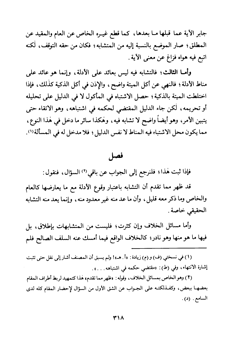وَأَمَّا مَسَائِلُ الْخِلَافِ وَإِنْ كَثُرَتْ؛ فَلَيْسَتْ مِنَ الْمُتَشَابِهَاتِ بِإِطْلَاقٍ، بَلْ فِيهَا مَا هُوَ مِنْهَا وَهُوَ نَادِرٌ؛ كَالْخِلَافِ الْوَاقِعِ فِيمَا أَمْسَكَ عنه السلف الصالح فلم