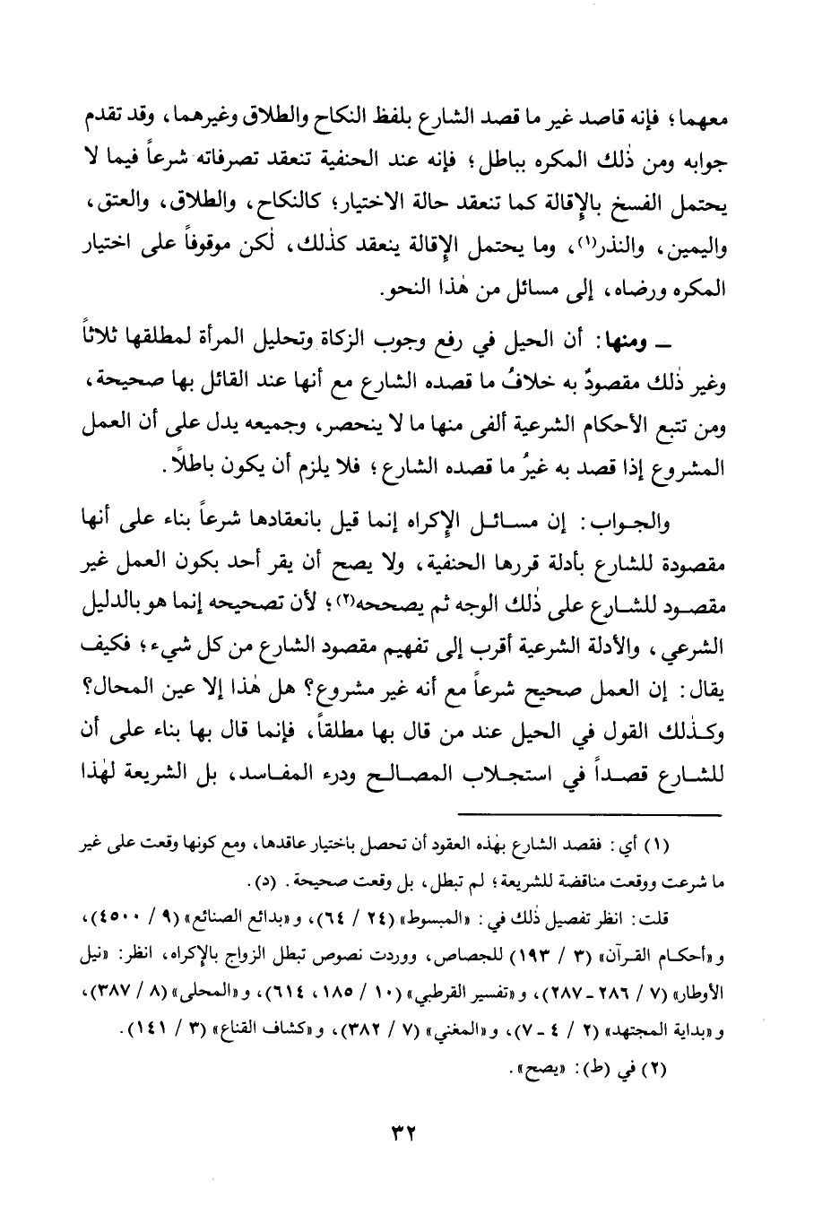 وَالْجَوَابُ: أَنَّ مَسَائِلَ الْإِكْرَاهِ إِنَّمَا قِيلَ بِانْعِقَادِهَا شَرْعًا بِنَاءً عَلَى أَنَّهَا مَقْصُودَةٌ لِلشَّارِعِ بِأَدِلَّةٍ قَرَّرَهَا الْحَنَفِيَّةُ، وَلَا يَصِحُّ أَنْ يُقِرَّ أَحَدٌ بِكَوْنِ الْعَمَلِ غَيْرَ مَقْصُودٍ لِلشَّارِعِ عَلَى ذَلِكَ الْوَجْهِ ثُمَّ يُصَحِّحُهُ2، لِأَنَّ تَصْحِيحَهُ إِنَّمَا هُوَ بِالدَّلِيلِ الشَّرْعِيِّ، وَالْأَدِلَّةُ الشَّرْعِيَّةُ أَقْرَبُ إِلَى تَفْهِيمِ مَقْصُودِ الشَّارِعِ مِنْ كُلِّ شَيْءٍ؛ فَكَيْفَ يُقَالُ: إِنَّ الْعَمَلَ صَحِيحٌ شَرْعًا مَعَ أَنَّهُ غَيْرُ مَشْرُوعٍ؟ هَلْ هَذَا إِلَّا عَيْنُ الْمُحَالِ؟ وَكَذَلِكَ الْقَوْلُ فِي الْحِيَلِ عِنْدَ مَنْ قَالَ بِهَا مُطْلَقًا، فَإِنَّمَا قَالَ بِهَا بِنَاءً عَلَى أَنَّ لِلشَّارِعِ قَصْدًا فِي اسْتِجْلَابِ الْمَصَالِحِ وَدَرْءِ المفاسد، بل الشريعة لهذا