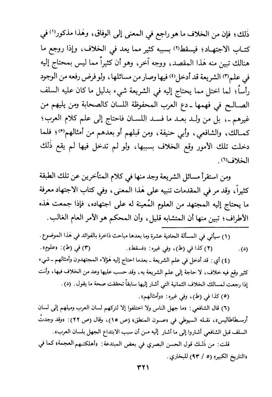 ذَلِكَ؛ فَإِنَّ مِنَ الْخِلَافِ مَا هُوَ رَاجِعٌ فِي الْمَعْنَى إِلَى الْوِفَاقِ، وَهَذَا مَذْكُورٌ1 فِي كتاب الاجتهاد؛ فيسقط2 بِسَبَبِهِ كَثِيرٌ مِمَّا يُعَدُّ فِي الْخِلَافِ، وَإِذَا رُوجِعَ مَا هُنَالِكَ تَبَيَّنَ مِنْهُ هَذَا الْمَقْصِدُ، وَوَجْهٌ آخَرُ، وَهُوَ أَنَّ كَثِيرًا مِمَّا لَيْسَ بِمُحْتَاجٍ إِلَيْهِ فِي عِلْمِ3 الشَّرِيعَةِ قَدْ أُدْخِلَ4 فِيهَا وَصَارَ مِنْ مَسَائِلِهَا، وَلَوْ فُرِضَ رَفْعُهُ مِنَ الْوُجُودِ رَأْسًا؛ لَمَا اخْتَلَّ مِمَّا يَحْتَاجُ إليه في الشريعة شيء بِدَلِيلِ مَا كَانَ عَلَيْهِ السَّلَفُ الصَّالِحُ فِي فَهْمِهَا -دَعِ الْعَرَبَ الْمَحْفُوظَةَ اللِّسَانِ كَالصَّحَابَةِ وَمَنْ يليهم من غيرهم-، وبل مَنْ وُلِدَ بَعْدَ مَا فَسَدَ اللِّسَانُ فَاحْتَاجَ إِلَى عِلْمِ كَلَامِ الْعَرَبِ؛ كَمَالِكٍ، وَالشَّافِعِيِّ، وَأَبِي حنيفة، ومن قبلهم أو بعدهم من أمثالهم5؛ فَلَمَّا دَخَلَتْ تِلْكَ الْأُمُورُ وَقَعَ الْخِلَافُ بِسَبَبِهَا، وَلَوْ لَمْ تَدْخُلْ فِيهَا لَمْ يَقَعْ ذَلِكَ الْخِلَافُ6.
