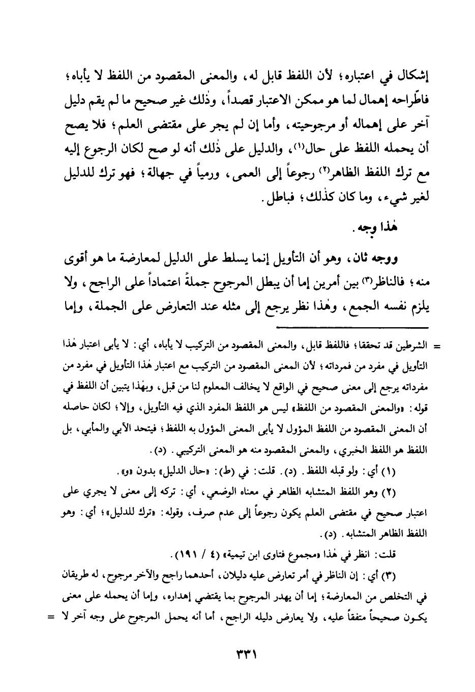 وَوَجْهٌ ثَانٍ، وَهُوَ أَنَّ التَّأْوِيلَ إِنَّمَا يُسَلَّطُ عَلَى الدَّلِيلِ لِمُعَارَضَةِ مَا هُوَ أَقْوَى مِنْهُ؛ فَالنَّاظِرُ3 بَيْنَ أَمْرَيْنِ إِمَّا أَنْ يُبْطِلَ الْمَرْجُوحَ جُمْلَةً اعْتِمَادًا عَلَى الرَّاجِحِ، وَلَا يُلْزِمُ نَفْسَهُ الْجَمْعَ، وَهَذَا نَظَرٌ يُرْجَعُ إِلَى مِثْلِهِ عِنْدَ التَّعَارُضِ على الجملة، وإما