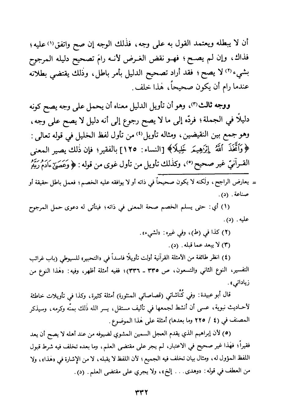 وَوَجْهٌ ثَالِثٌ3، وَهُوَ أَنَّ تَأْوِيلَ الدَّلِيلِ مَعْنَاهُ أَنْ يُحْمَلَ عَلَى وَجْهٍ يَصِحُّ كَوْنُهُ دَلِيلًا فِي الجملة؛ فرده إلى ما لا يَصِحُّ رُجُوعٌ إِلَى أَنَّهُ دَلِيلٌ لَا يَصِحُّ عَلَى وَجْهٍ، وَهُوَ جَمْعٌ بَيْنَ النَّقِيضَيْنِ، وَمِثَالُهُ تَأْوِيلُ4 مَنْ تَأَوَّلَ لَفَظَ الْخَلِيلِ فِي قَوْلِهِ تَعَالَى: {وَاتَّخَذَ اللَّهُ إِبْرَاهِيمَ خَلِيلًا} [النِّسَاءِ: 125] بِالْفَقِيرِ؛ فَإِنَّ ذَلِكَ يُصَيِّرُ الْمَعْنَى الْقُرْآنِيَّ غَيْرَ صَحِيحٍ5، وَكَذَلِكَ تَأْوِيلُ مَنْ تَأَوَّلَ غَوَى مِنْ قَوْلِهِ: {وَعَصَى آدَمُ رَبَّه