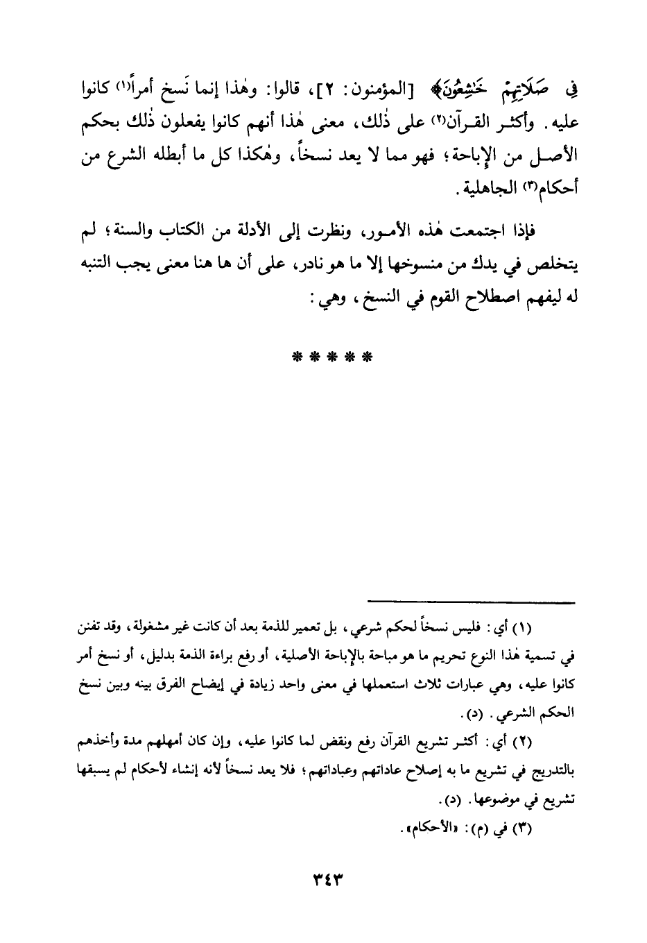 فِي صَلاتِهِمْ خَاشِعُونَ} [الْمُؤْمِنُونَ: 2] ، قَالُوا: وَهَذَا إِنَّمَا نَسَخَ أَمْرًا1 كَانُوا عَلَيْهِ. وَأَكْثَرُ الْقُرْآنِ2 عَلَى ذَلِكَ، مَعْنَى هَذَا أَنَّهُمْ كَانُوا يَفْعَلُونَ ذَلِكَ بِحُكْمِ الْأَصْلِ مِنَ الْإِبَاحَةِ؛ فَهُوَ مِمَّا لَا يُعَدُّ نَسْخًا، وَهَكَذَا كُلُّ مَا أَبْطَلَهُ الشَّرْعُ مِنْ أَحْكَامِ3 الْجَاهِلِيَّةِ.