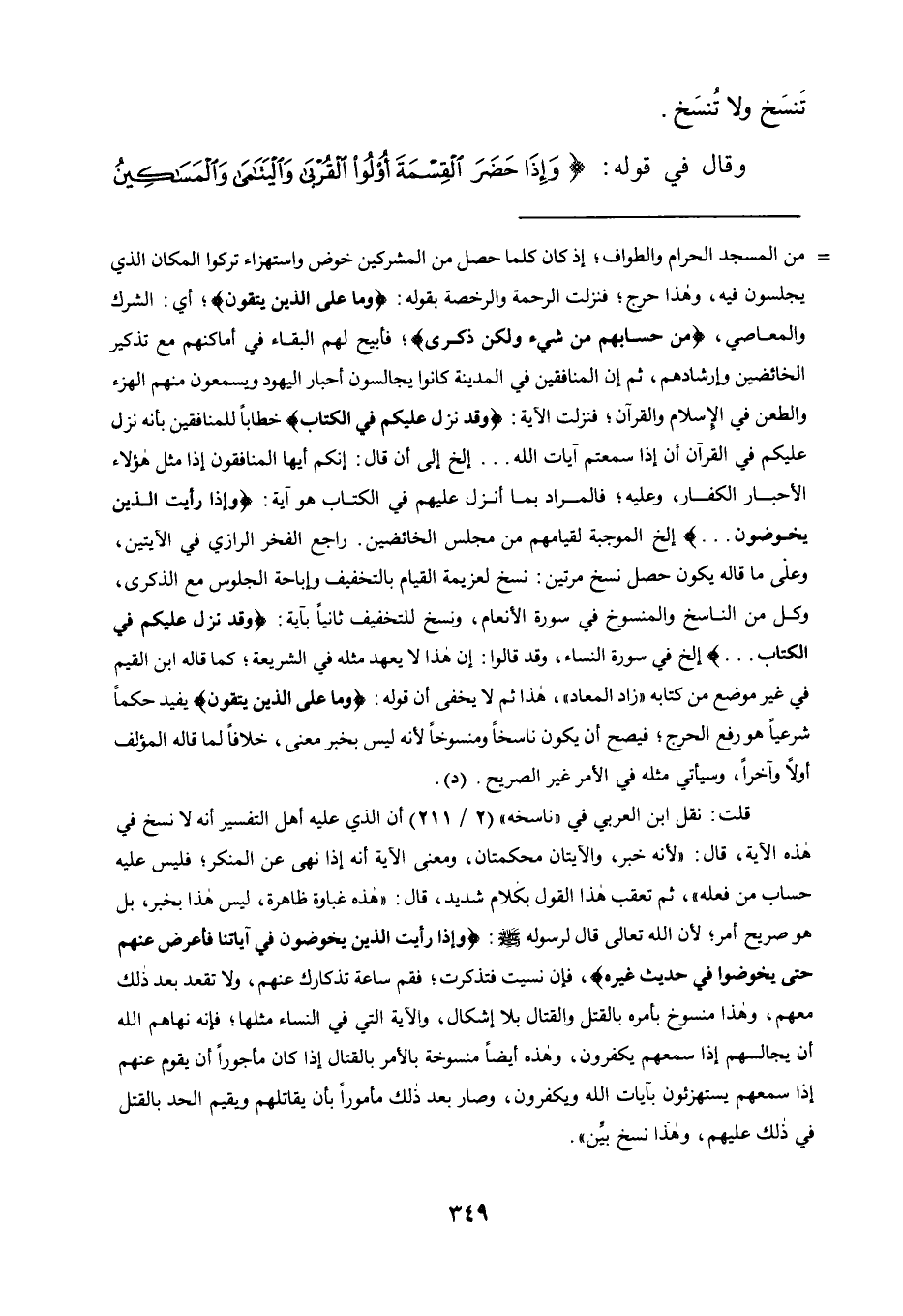 قلت: نقل ابن العربي في "ناسخه" "2/ 211" أن الذي عليه أهل التفسير أنه لا نسخ في هذه الآية، قال: "لأنه خبر، والآيتان محكمتان، ومعنى الآية أنه إذا نهى عن المنكر؛ فليس عليه حساب من فعله"، ثم تعقب هذا القول بكلام شديد، قال: "هذه غباوة ظاهرة، ليس هذا بخبر، بل هو صريح أمر؛ لأن الله تعالى قال لرسوله صلى الله عليه وسلم: {وَإِذَا رَأَيْتَ الَّذِينَ يَخُوضُونَ فِي آيَاتِنَا فَأَعْرِضْ عَنْهُمْ حَتَّى يَخُوضُوا فِي حَدِيثٍ غَيْرِه} ، فإن نسيت فتذكرت؛ فقم ساعة تذكارك عنهم، ولا تقعد بعد ذلك معهم، وهذا منسوخ بأمره بالقتل والقتال بلا إشكال، والآية التي في النساء مثلها؛ فإنه نهاهم الله أن يجالسهم إذا سمعهم يكفرون، وهذه أيضًا منسوخة بالأمر بالقتال إذا كان مأجورًا أن يقوم عنهم إذا سمعهم يستهزئون بآيات الله ويكفرون، وصار بعد ذلك مأمورًا بأن يقاتلهم ويقيم الحد بالقتل في ذلك عليهم، وهذا نسخ بين".
