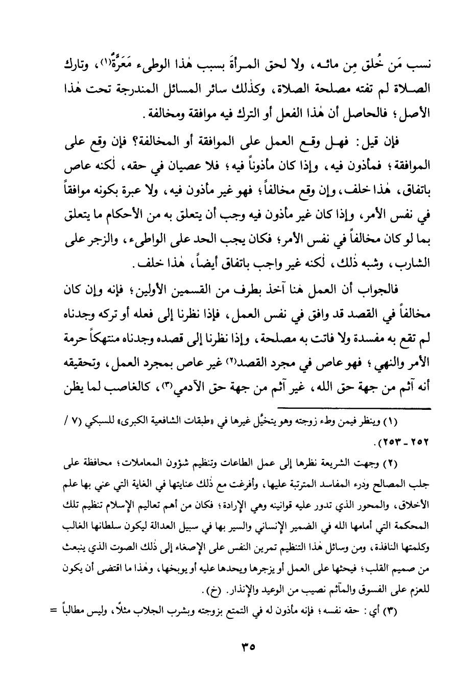 نَسَبُ مَنْ خُلِقَ مِنْ مَائِهِ، وَلَا لَحِقَ الْمَرْأَةَ بِسَبَبِ هَذَا الْوَطْءِ مَعَرَّةٌ1، وَتَارِكُ الصَّلَاةِ لَمْ تَفُتْهُ مَصْلَحَةُ الصَّلَاةِ، وَكَذَلِكَ سَائِرُ الْمَسَائِلِ الْمُنْدَرِجَةِ تَحْتَ هَذَا الْأَصْلِ؛ فَالْحَاصِلُ أَنَّ هَذَا الْفِعْلَ أَوِ التَّرْكَ فِيهِ مُوَافَقَةٌ وَمُخَالَفَةٌ.