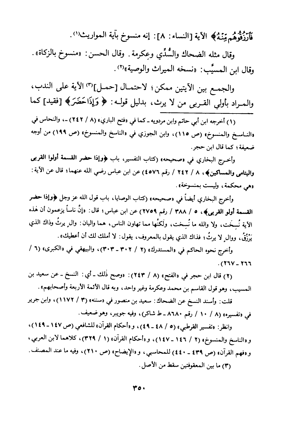 وأخرج البخاري في "صحيحه" "كتاب التفسير، باب {وَإِذَا حَضَرَ الْقِسْمَةَ أُولُو الْقُرْبَى وَالْيَتَامَى وَالْمَسَاكِينُ} ، 5/ 388/ رقم 4576" عن ابن عباس رضي الله عنهما؛ قال عن الآية: "هي محكمة، وليست بمنسوخة".