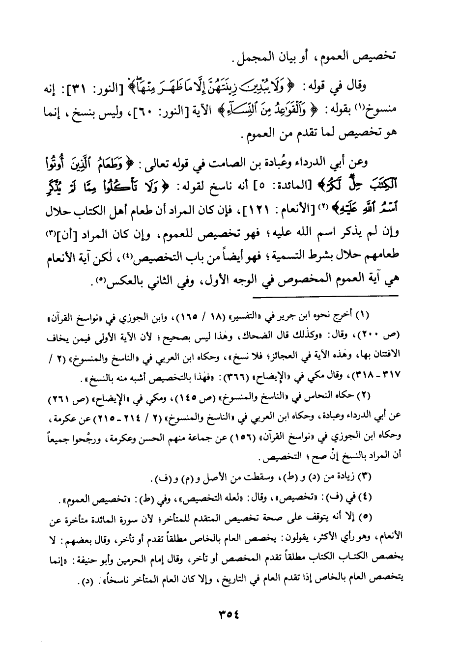 وَعَنْ أَبِي الدَّرْدَاءِ وَعُبَادَةَ بْنِ الصَّامِتِ فِي قَوْلِهِ تَعَالَى: {وَطَعَامُ الَّذِينَ أُوتُوا الْكِتَابَ حِلٌّ لَكُمْ} [الْمَائِدَةِ: 5] أَنَّهُ نَاسِخٌ لِقَوْلِهِ: {وَلا تَأْكُلُوا مِمَّا لَمْ يُذْكَرِ اسْمُ اللَّهِ عَلَيْهِ} 2 [الْأَنْعَامِ: 121] ، فَإِنْ كَانَ الْمُرَادُ أَنَّ طَعَامَ أَهْلِ الْكِتَابِ حَلَالٌ وَإِنْ لَمْ يُذْكَرِ اسْمُ اللَّهِ عَلَيْهِ؛ فَهُوَ تَخْصِيصٌ لِلْعُمُومِ، وَإِنْ كَانَ الْمُرَادُ [أَنَّ] 3 طَعَامَهُمْ حَلَالٌ بِشَرْطِ التَّسْمِيَةِ؛ فَهُوَ أَيْضًا مِنْ بَابِ التَّخْصِيصِ4، لَكِنَّ آيَةَ الْأَنْعَامِ هِيَ آيَةُ الْعُمُومِ الْمَخْصُوصِ في الوجه الأول، وفي الثاني بالعكس5.