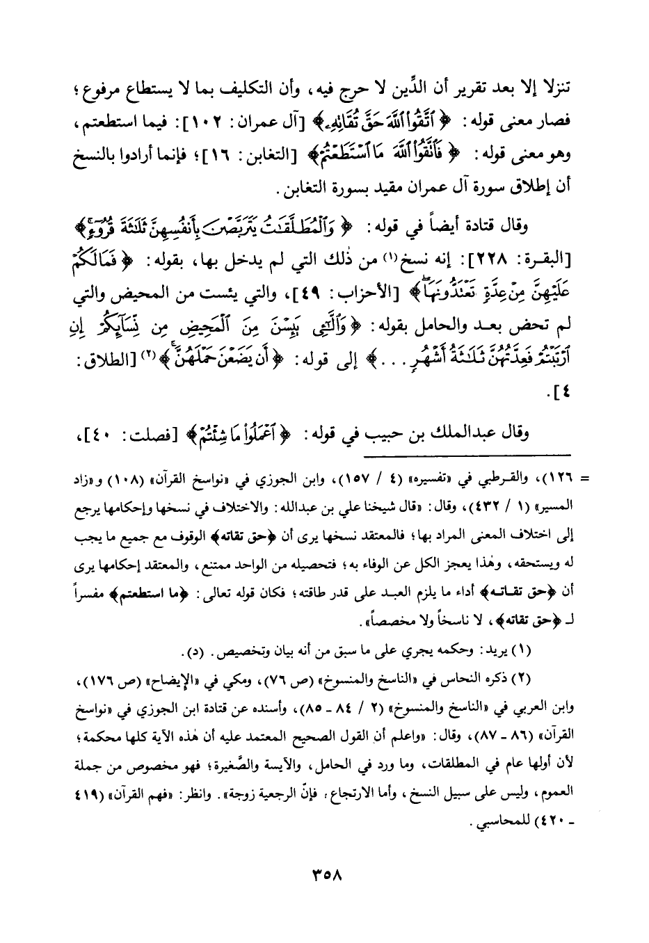 تَنْزِلَا إِلَّا بَعْدَ تَقْرِيرِ أَنَّ الدِّينَ لَا حَرَجَ فِيهِ، وَأَنَّ التَّكْلِيفَ بِمَا لَا يُسْتَطَاعُ مَرْفُوعٌ فَصَارَ مَعْنَى قَوْلِهِ: {اتَّقُوا اللَّهَ حَقَّ تُقَاتِهِ} [آلِ عِمْرَانَ: 102] : فِيمَا اسْتَطَعْتُمْ وَهُوَ مَعْنَى قَوْلِهِ: {فَاتَّقُوا اللَّهَ مَا اسْتَطَعْتُمْ} [التَّغَابُنِ: 16] ؛ فَإِنَّمَا أَرَادُوا بِالنَّسْخِ أَنَّ إِطْلَاقَ سُورَةِ آلِ عِمْرَانَ مقيدة بِسُورَةِ التَّغَابُنِ.