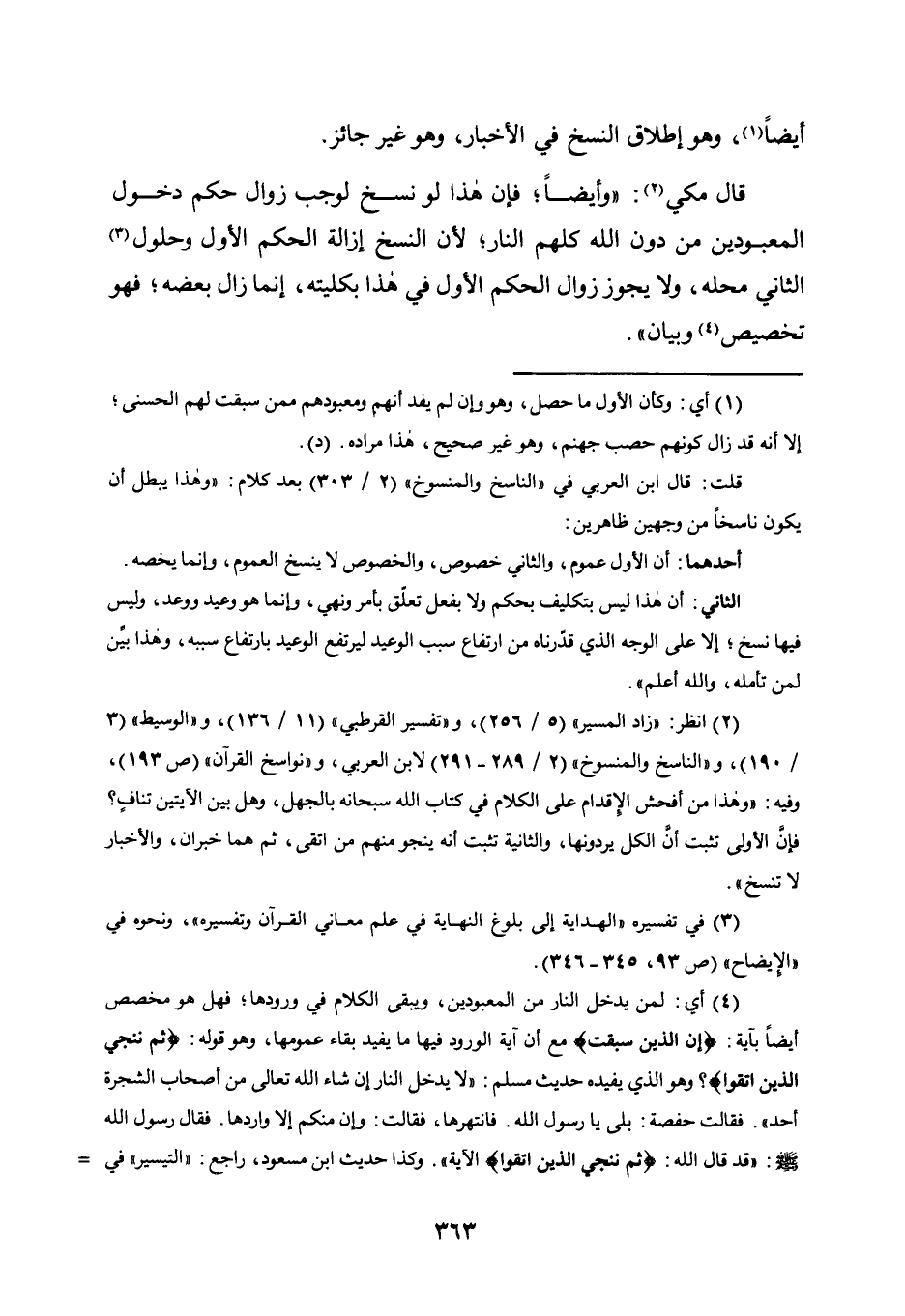 قَالَ مَكِّيٌّ2: "وَأَيْضًا؛ فَإِنَّ هَذَا لَوْ نُسِخَ لَوَجَبَ زَوَالُ حُكْمِ دُخُولِ الْمَعْبُودِينَ مِنْ دُونِ اللَّهِ كُلِّهِمُ النَّارَ؛ لِأَنَّ النَّسْخَ إِزَالَةُ الْحُكْمِ الْأَوَّلِ وَحُلُولُ3 الثَّانِي مَحَلَّهُ، وَلَا يَجُوزُ زَوَالُ الْحُكْمِ الْأَوَّلِ فِي هَذَا بِكُلِّيَّتِهِ، إنما زال بعضه؛ فهو تخصيص4 وبيان".