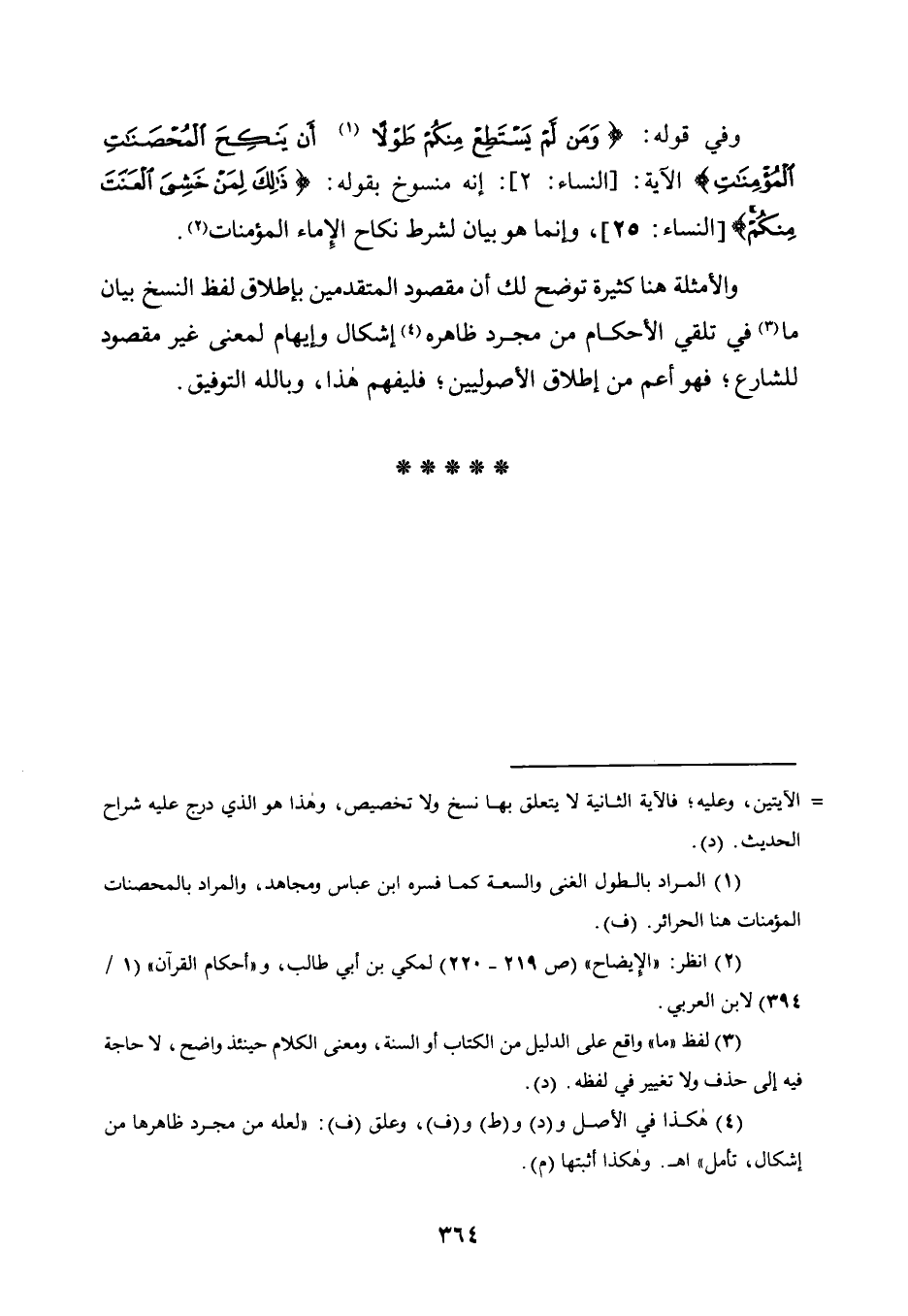 وَفِي قَوْلِهِ: {وَمَنْ لَمْ يَسْتَطِعْ مِنْكُمْ طَوْلًا 1 أَنْ يَنْكِحَ الْمُحْصَنَاتِ الْمُؤْمِنَاتِ} الْآيَةَ: [النِّسَاءِ: 2] : إِنَّهُ مَنْسُوخٌ بِقَوْلِهِ: {ذَلِكَ لِمَنْ خَشِيَ الْعَنَتَ مِنْكُمْ} [النِّسَاءِ: 25] ، وَإِنَّمَا هُوَ بَيَانٌ لِشَرْطِ نِكَاحِ الْإِمَاءِ الْمُؤْمِنَاتِ2.