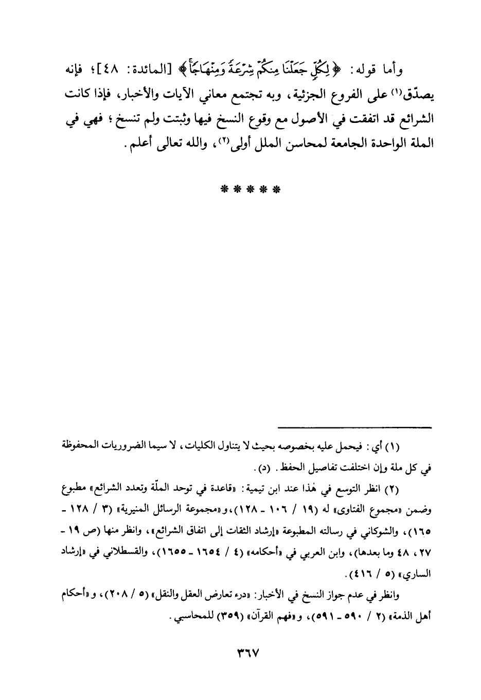 2 انظر التوسع في هذا عند ابن تيمية: "قاعدة في توحد الملة وتعدد الشرائع" مطبوع وضمن "مجموع الفتاوى" له "19/ 106-128"، و"مجموعة الرسائل المنيرية" "3/ 128-165"، والشوكاني في رسالته المطبوعة "إرشاد الثقات إلى اتفاق الشرائع"، وانظر منها "ص19-27، 48 وما بعدها"، وابن العربي في "أحكامه" "4/ 1654-1655"، والقسطلاني في "إرشاد الساري" "5/ 416".