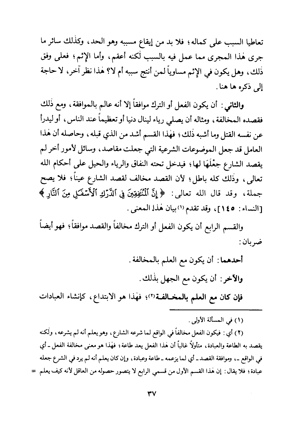 2 أي: فيكون الفعل مخالفا في الواقع لما شرعه الشارع، وهو يعلم أنه لم يشرعه، ولكنه يقصد به الطاعة والعبادة، متأولا غالبا أن هذا الفعل يعد طاعة؛ فهذا هو معنى مخالفة الفعل -أي في الواقع- وموافقة القصد -أي لما يزعمه- طاعة وعبادة، وإن كان يعلم أنه لم يرد في الشرع جعله عبادة؛ فلا يقال: إن هذا القسم الأول من قسمي الرابع لا يتصور حصوله من العاقل لأنه كيف يعلم أنه مخالف ويقصد به الموافقة لقصد الشارع؟ فمحصل هذا الضرب أن الفعل موافق في زعمه، وإن لم يكن جهلا صرفا كالضرب الثاني. "د".