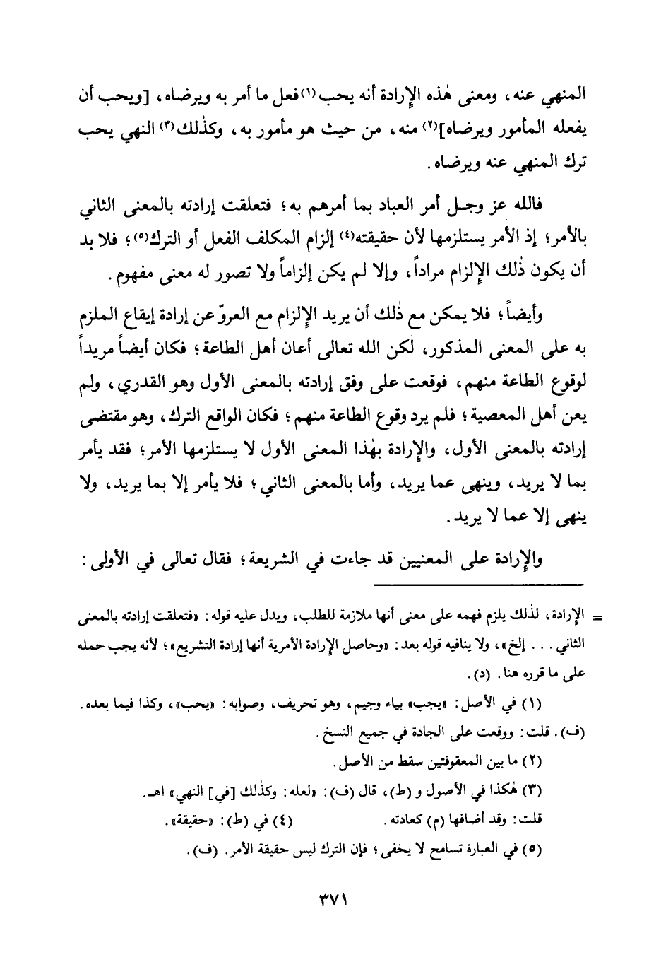 المنهي عنه، ومعنى هذه الإرادة أنه يجب1 فِعْلَ مَا أَمَرَ بِهِ وَيَرْضَاهُ، [وَيُحِبُّ أَنْ يَفْعَلَهُ الْمَأْمُورُ وَيَرْضَاهُ] 2 مِنْهُ، مِنْ حَيْثُ هُوَ مَأْمُورٌ بِهِ، وَكَذَلِكَ3 النَّهْيُ يُحِبُّ تَرْكَ الْمَنْهِيِّ عَنْهُ وَيَرْضَاهُ.