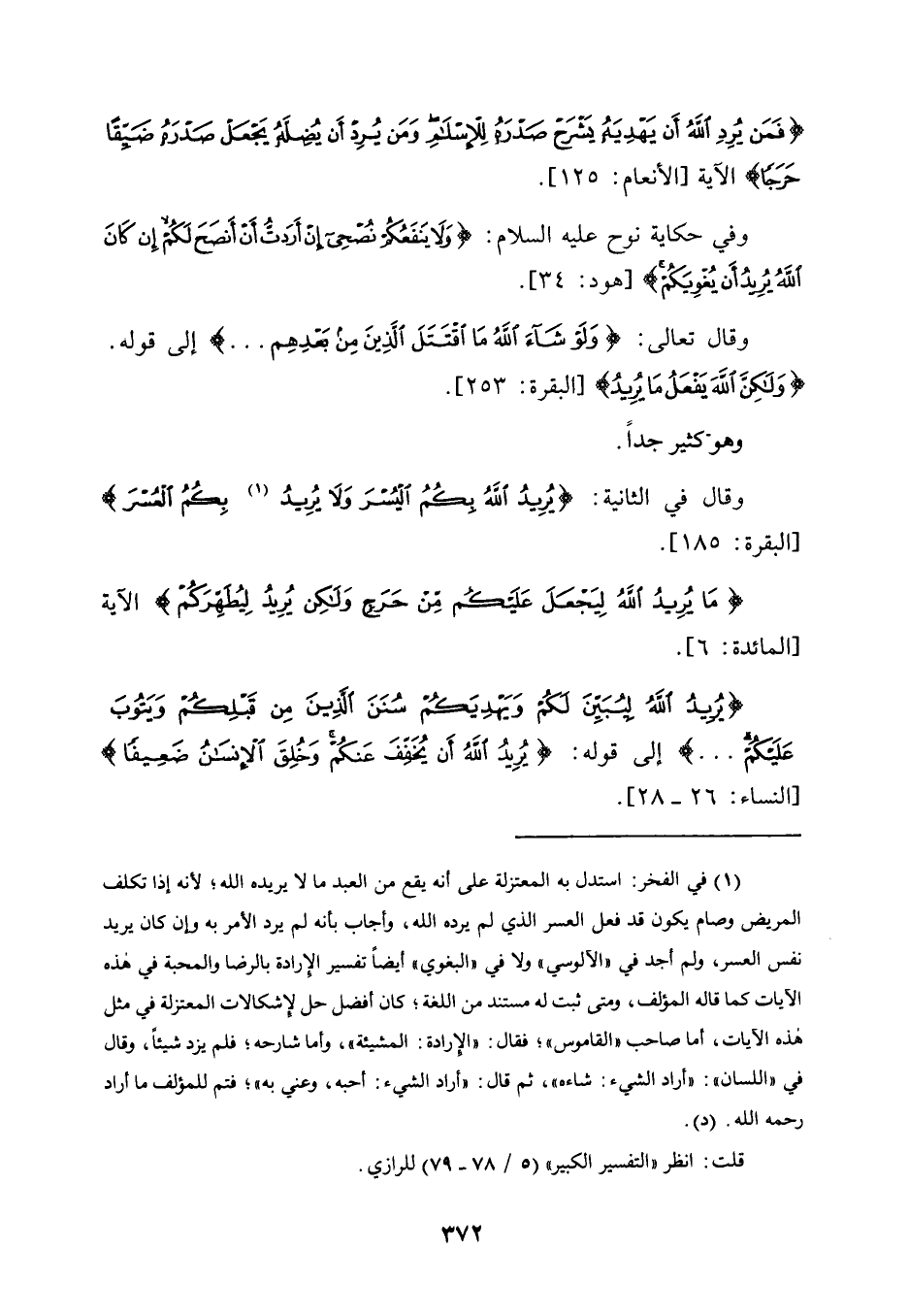 1 في الفخر: استدل به المعتزلة على أنه يقع من العبد ما لا يريده الله؛ لأنه إذا تكلف المريض وصام يكون قد فعل العسر الذي لم يرده الله، وأجاب بأنه لم يرد الأمر به وإن كان يريد نفس العسر، ولم أجد في "الآلوسي" ولا في "البغوي" أيضا تفسير الإرادة بالرضا والمحبة في هذه الآيات كما قاله المؤلف، ومتى ثبت له مستند من اللغة؛ كان أفضل حل لإشكالات المعتزلة في مثل هذه الآيات، أما صاحب "القاموس"؛ فقال: "الإرادة: المشيئة"، وأما شارحه؛ فلم يزد شيئا، وقال في "اللسان": "أراد الشيء: شاءه"، ثم قال: "أراد الشيء: أحبه، وعني به"؛ فتم للمؤلف ما أراد رحمه الله. "د".