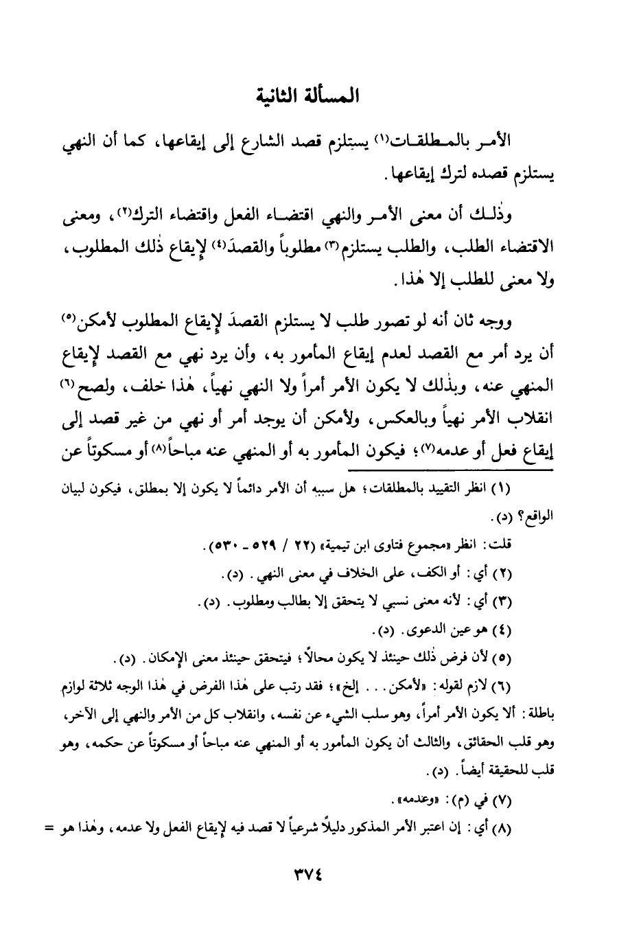 وَوَجْهٌ ثَانٍ أَنَّهُ لَوْ تُصُوِّرَ طَلَبٌ لَا يَسْتَلْزِمُ الْقَصْدَ لِإِيقَاعِ الْمَطْلُوبِ لَأَمْكَنَ5 أَنْ يَرِدَ أَمْرٌ مَعَ الْقَصْدِ لِعَدَمِ إِيقَاعِ الْمَأْمُورِ بِهِ، وَأَنْ يَرِدَ النهي مَعَ الْقَصْدِ لِإِيقَاعِ الْمَنْهِيِّ عَنْهُ، وَبِذَلِكَ لَا يَكُونُ الْأَمْرُ أَمْرًا وَلَا النَّهْيُ نَهْيًا، هَذَا خُلْفٌ، وَلَصَحَّ6 انْقِلَابُ الْأَمْرِ نَهْيًا وَبِالْعَكْسِ، وَلَأَمْكَنَ أَنْ يُوجَدَ أَمْرٌ أَوْ نَهْيٌ مِنْ غَيْرِ قَصْدٍ إِلَى إِيقَاعِ فِعْلٍ أَوْ عَدِمَهُ7؛ فَيَكُونُ الْمَأْمُورُ بِهِ أَوِ الْمَنْهِيُّ عَنْهُ مُبَاحًا8 أَوْ مسكوتا عن
