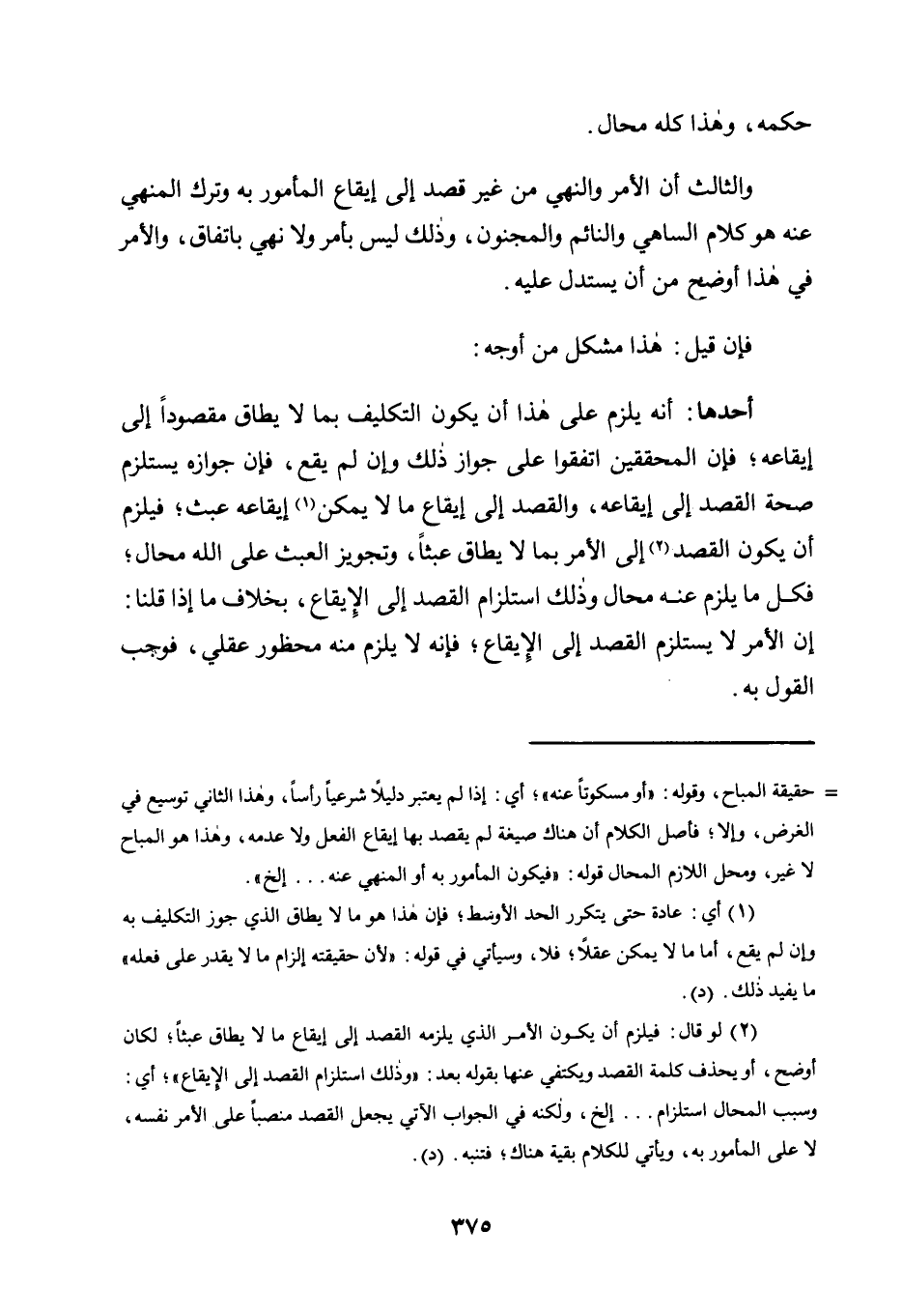 2 لو قال: فيلزم أن يكون الأمر الذي يلزمه القصد إلى إيقاع ما لا يطاق عبثًا؛ لكان أوضح، أو يحذف كلمة القصد ويكتفي عنها بقوله بعد: "وذلك استلزام القصد إلى الإيقاع"؛ أي: وسبب المحال استلزام ... إلخ، ولكنه في الجواب الآتي يجعل القصد منصبًا على الأمر نفسه، لا على المأمور به، ويأتي للكلام بقية هناك؛ فتنبه. "د".